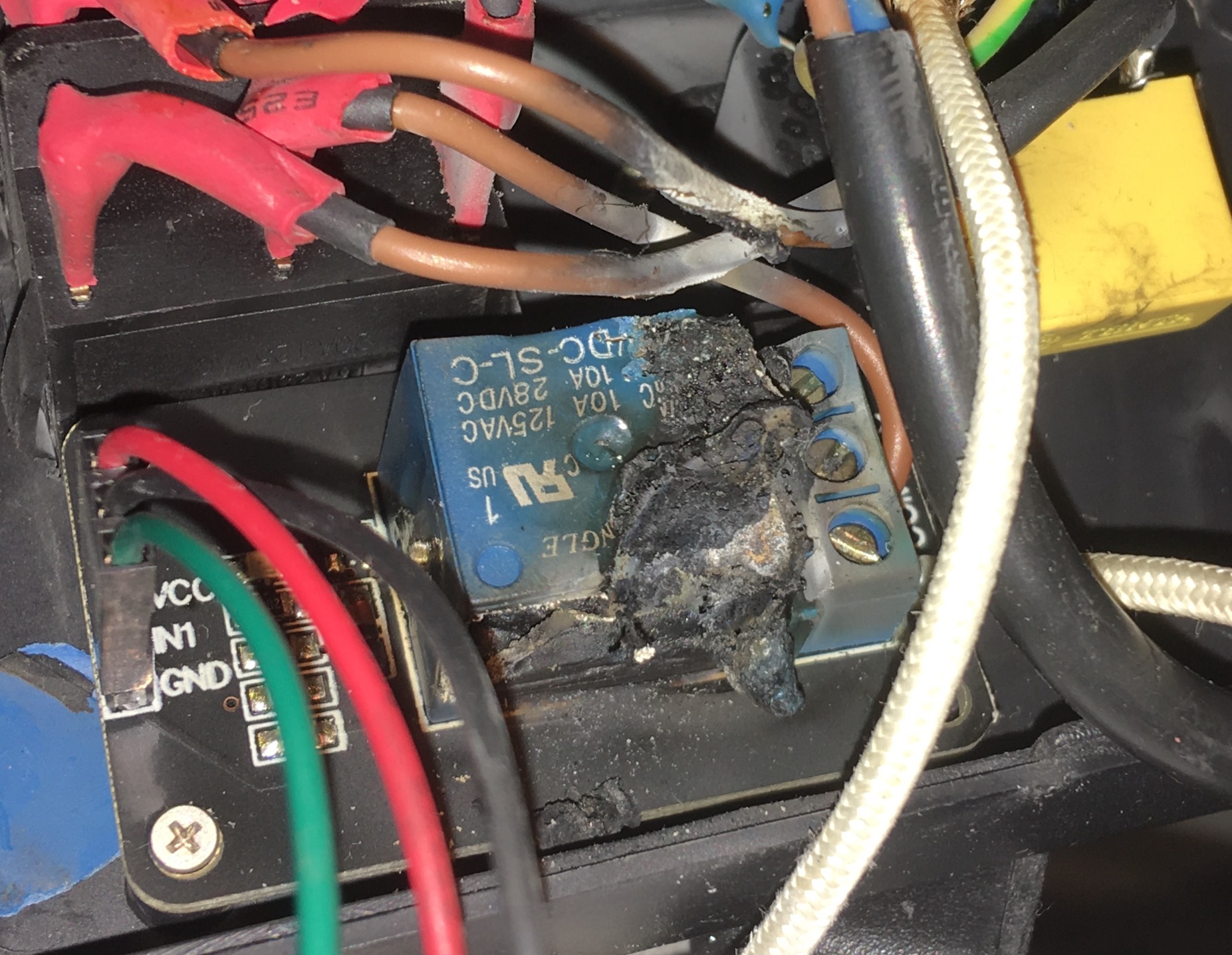 Tak vypadá to, ze byl problém nalezen. Relé je kompletně shořelé. Je to zvláštní, protože při první fázi problému, jsme tuto krabičku kontrolovali a žádný takový problém tam nebyl. Nicméně tím se vysvětluje, ze podložka vyhriva i když není zapnutá tiskárna.