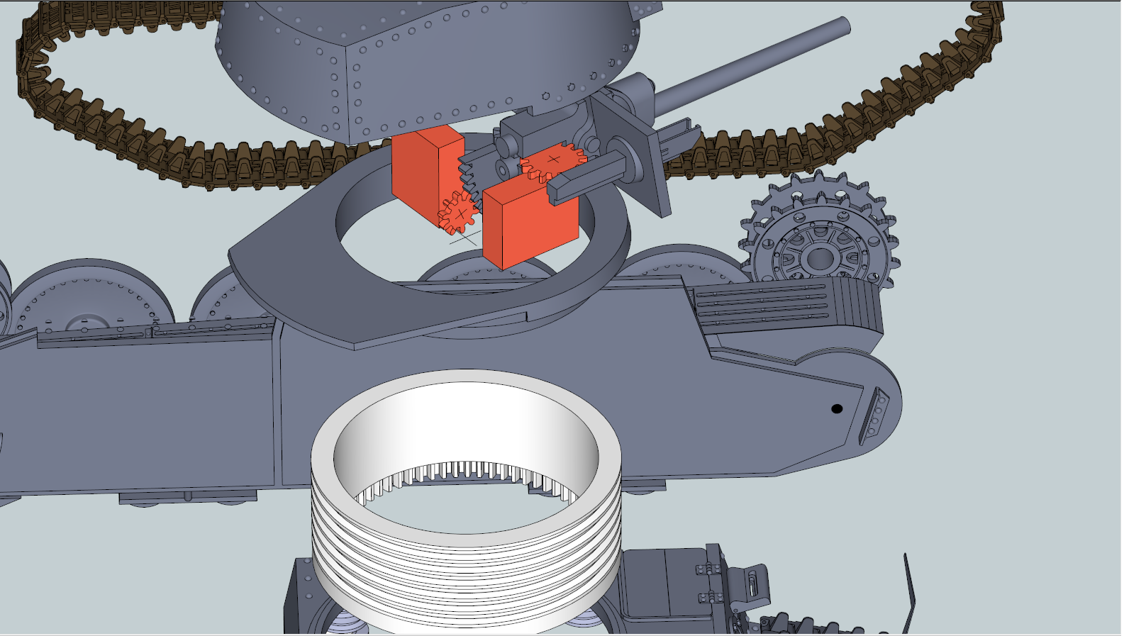čo sa týka motorov a prevodov - bežné RC tanky majú motory zhruba od 8500 - 22000 otáčok a prevodovky 3:1 po 5:1.môj tank má vďaka velkej hmotnosti a ploche pásu až priam nečakane velké nároky na výkon prevodoviek.