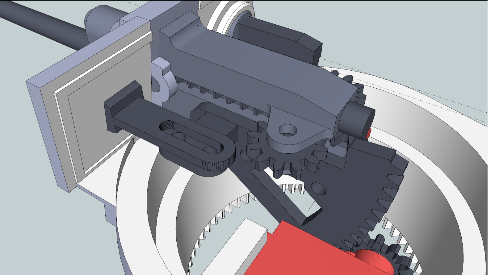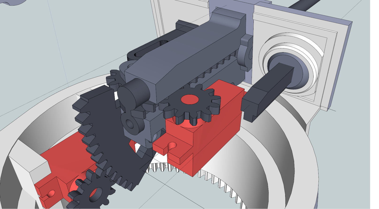 Snazim se o co mozna nejvetsi pocet tisknutelnych dilu, zkratka aby se dokoupily jen sroubky, loziska, serva a motory, elektronika a jinak to slo cele vytisknout. Z tech obrazku to neni patrne, ale ty motory uz jsou s tovarni prevodovkou, ty tistene ozubene kola maji myslim prevod jen 1:1,5 a maji za ukol dostat hridel co nejbliz prednimu panciri, v realu jsou samozrejme pouzite koncove redukce, ale ty ja tam nechci, i kdyz by to asi take slo. Samotny motor ma pak asi prevod kolem 1:120 nebo dokonce 1:250 ted uz presne nevim a prislo mi, ze pri takovem prevodu se musi ten motorek chechtat, ale je to muj laicky pocit, zrejme me to vyskoli. Predpokladam pevnou prevodovku s tim ze ryrchlost bude mozne castecne ovlivnit napetim cca 3 - 6 V, s mechaniskym razenim jsem vubec nepocital, melo by jit spis o pokojovou zalezitost na hrani, ani zadne truck trial vykony od toho necekam.