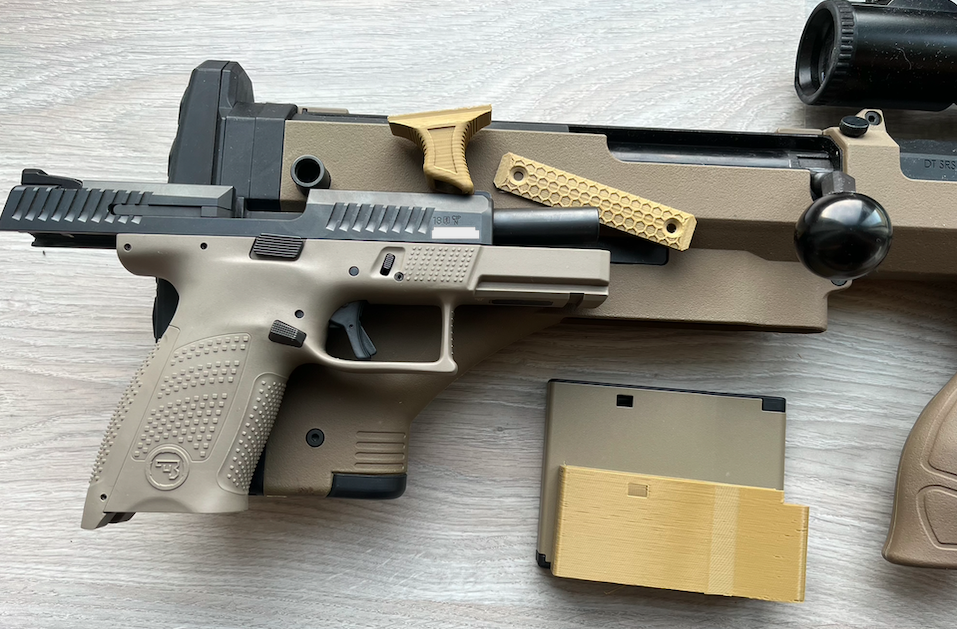 Sehnal jsem na zkousku Spectrum PLA Military Khaki. Porovnani barevnosti na fotce. Jak dlouha, tak kratka zbran je v barve FDE (ta CZ je vice do seda). Obe zbrane jsou plastove. Zasobnik do dlouhe zbrane je kovovy a je videt, ze oproti plastu ma lehce jinou barvu (je to takto primo komplet ke zbrani).