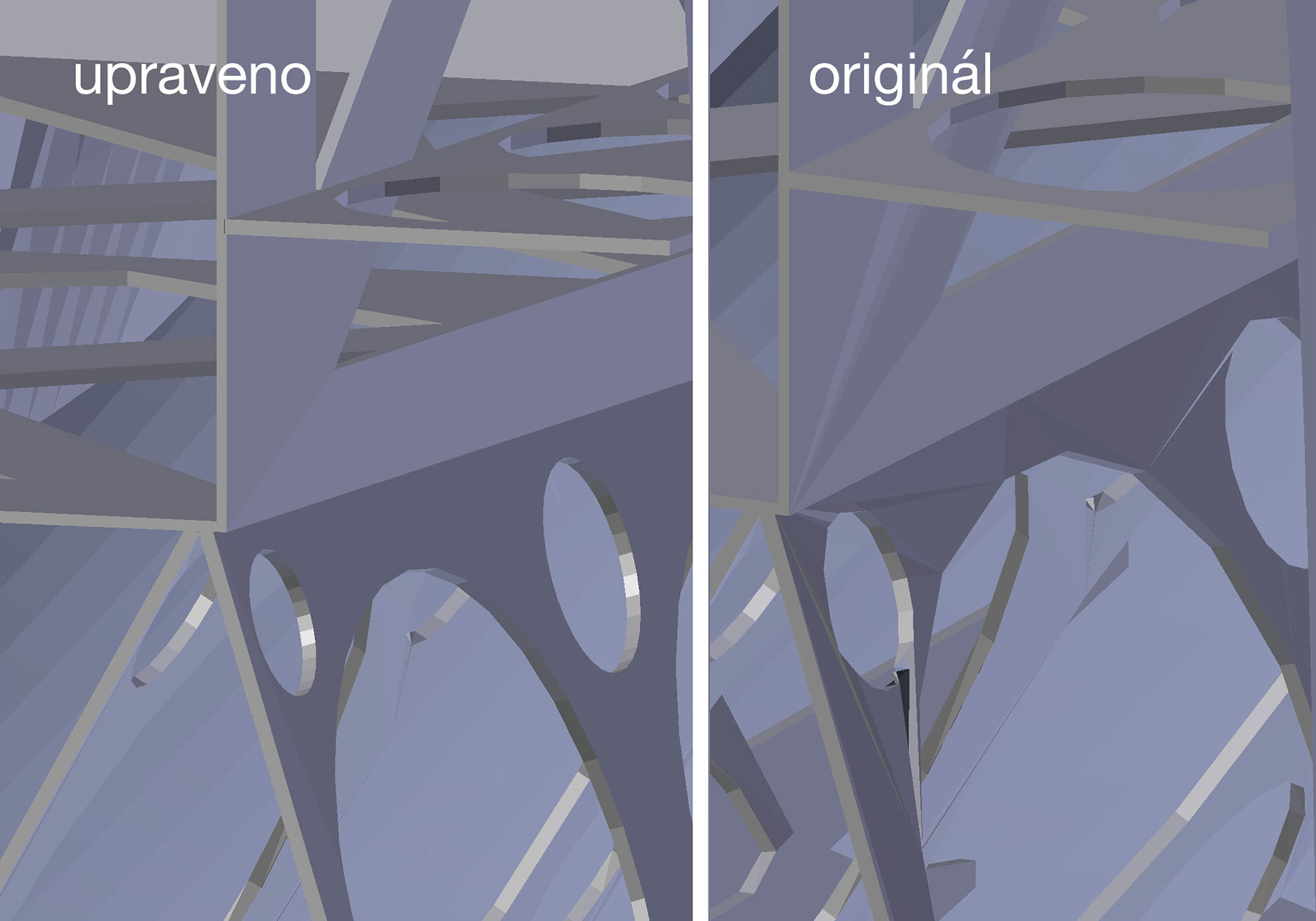Zde je příklad úprav, v podstatě jsem sáhl na každý díl. Někde stačilo jen zarovnat, jinde sem musel upravit tvar vnitřních výztuh, protože S3D mělo velký problém si s tím poradit. Přední díl se dokonce musel narotovat o 132,5°, aby ho S3D naslicoval správně. To je mi velká záhada, že v S3D stačí objekt pootočit podle osy Z, a slicne se úplně jinak. Asi horká jehla, a updaty v nedohlednu. Hlavně si to kup, zákazníku...