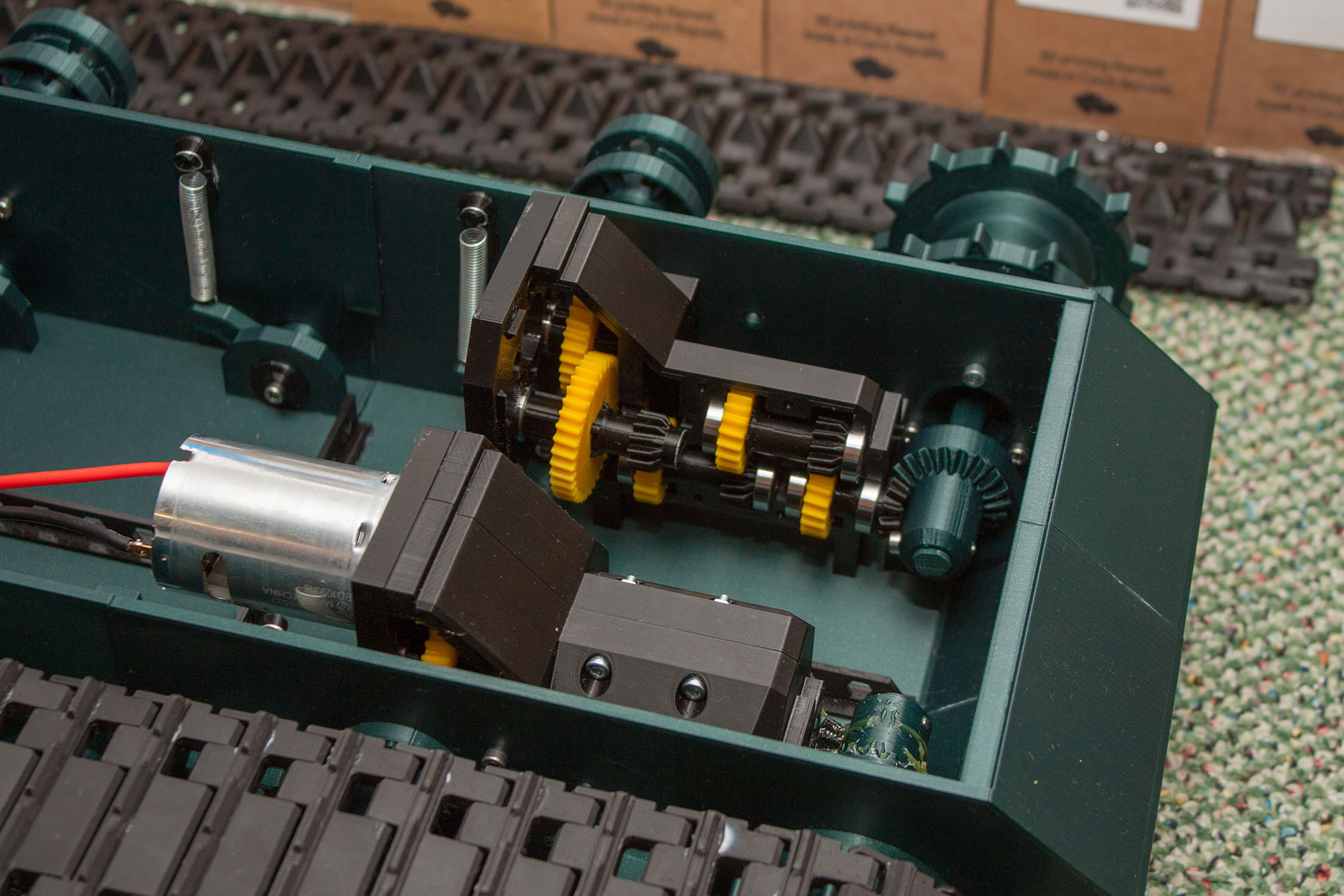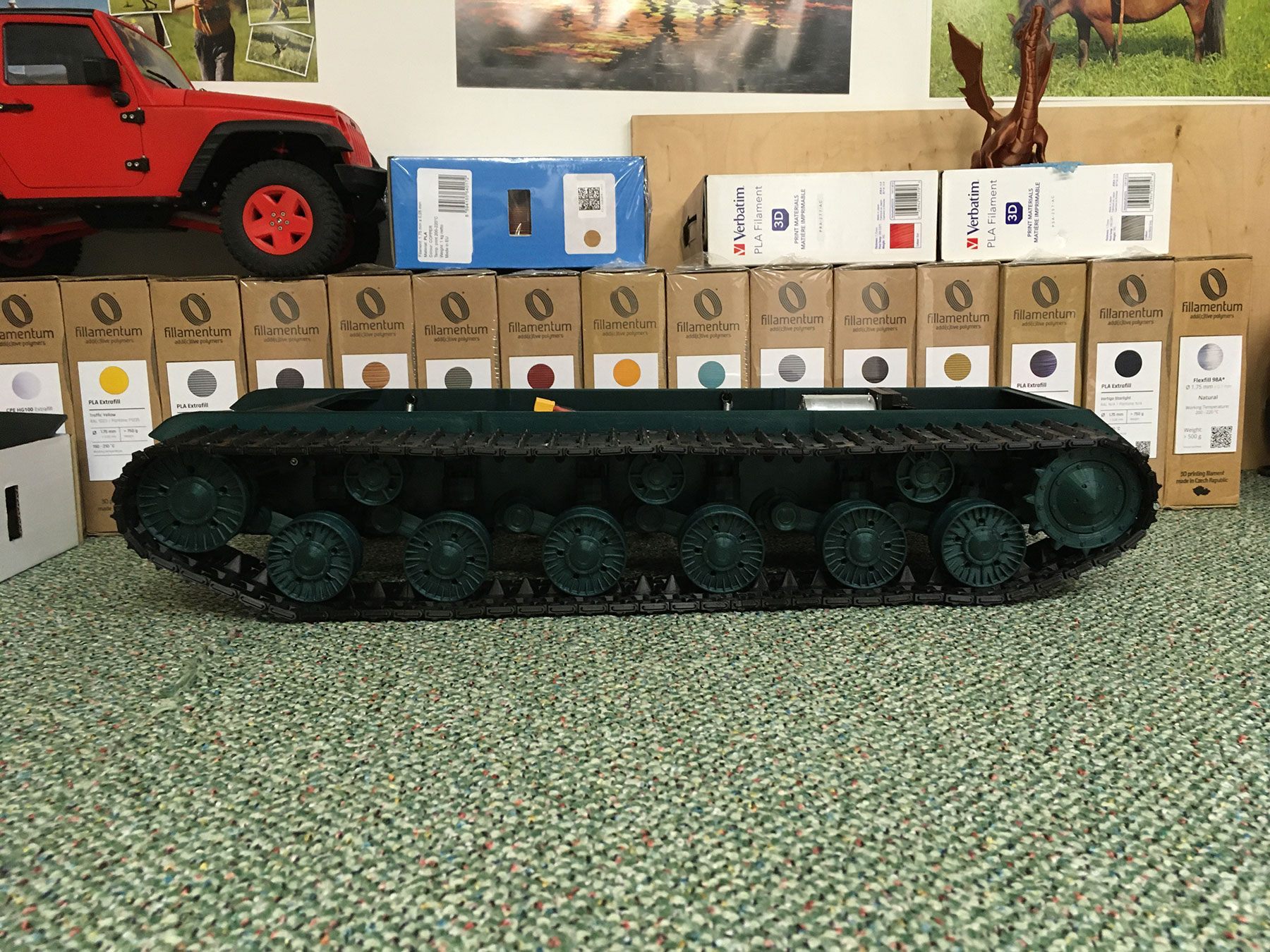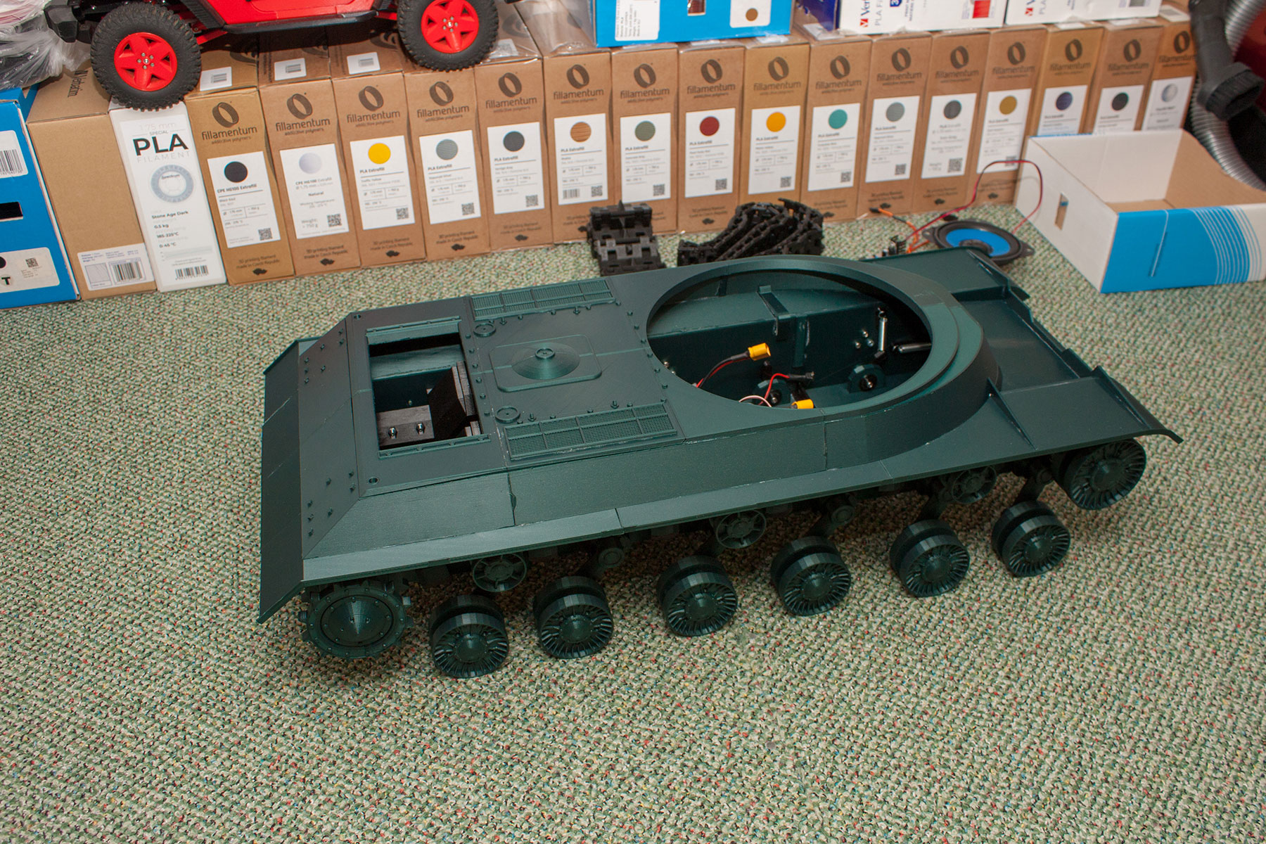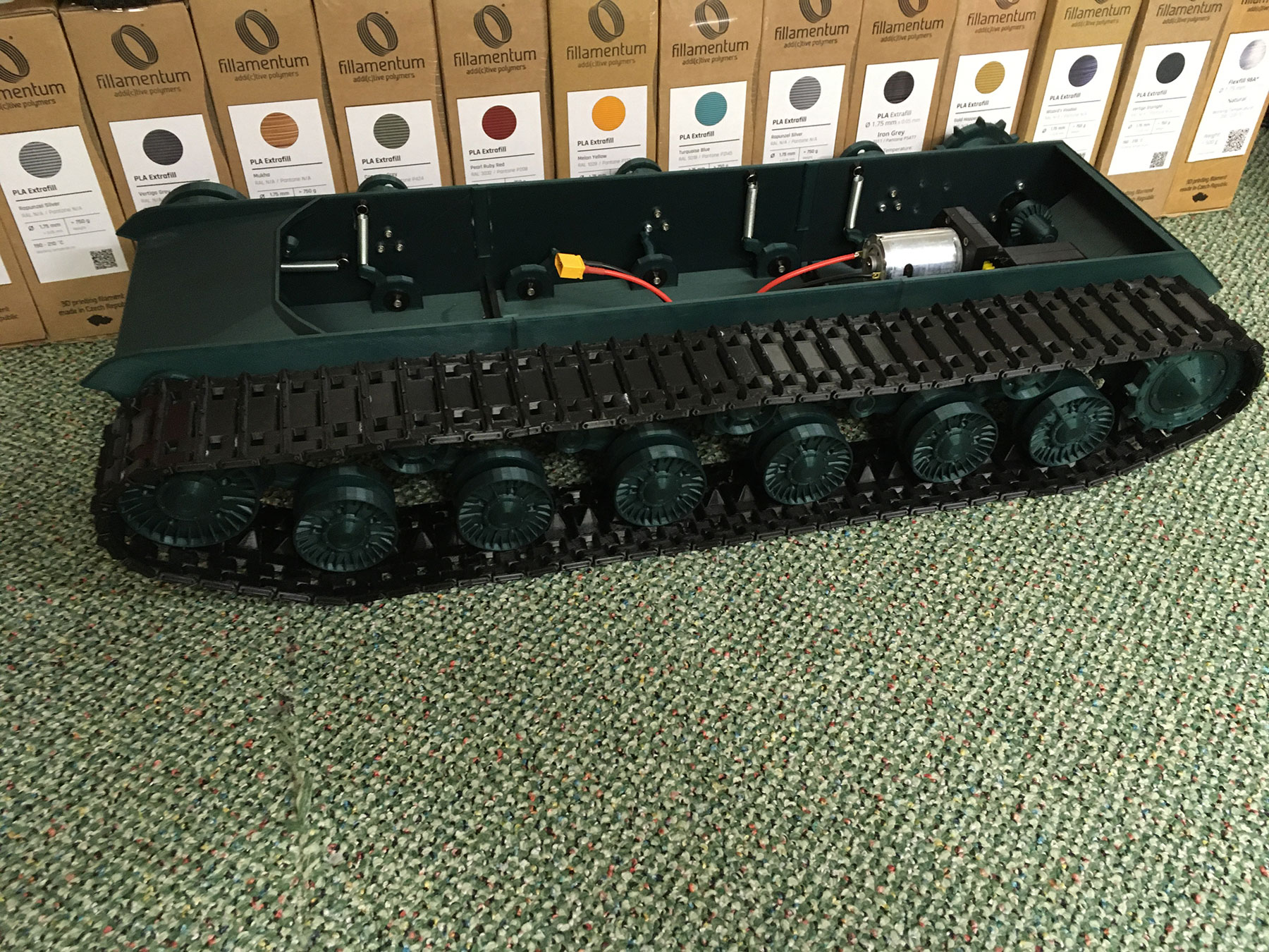 Všechna kola už jsou vytištěna a osazena, chybí půlka pravého pásu.