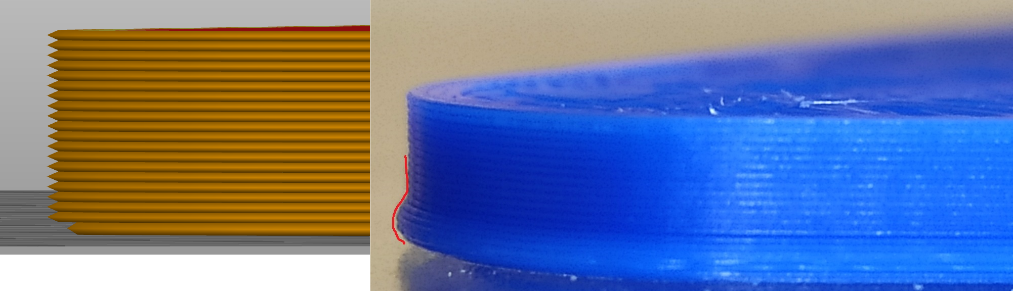 Skusil som v prusaslicery nastavit Kompenzaciu rozplacnutia prvej vrstvy a aj sa pri tlaci to vykona, ale dalsie 2-5 vrstiev su sirsie a potom ostatne su uz v poriadku.