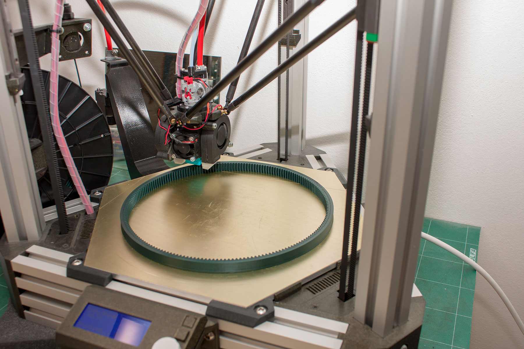Včera jsem tiskl vcelku to spodní velké ozubené kolo - 4,5 hod (má průměr 21,65 cm).