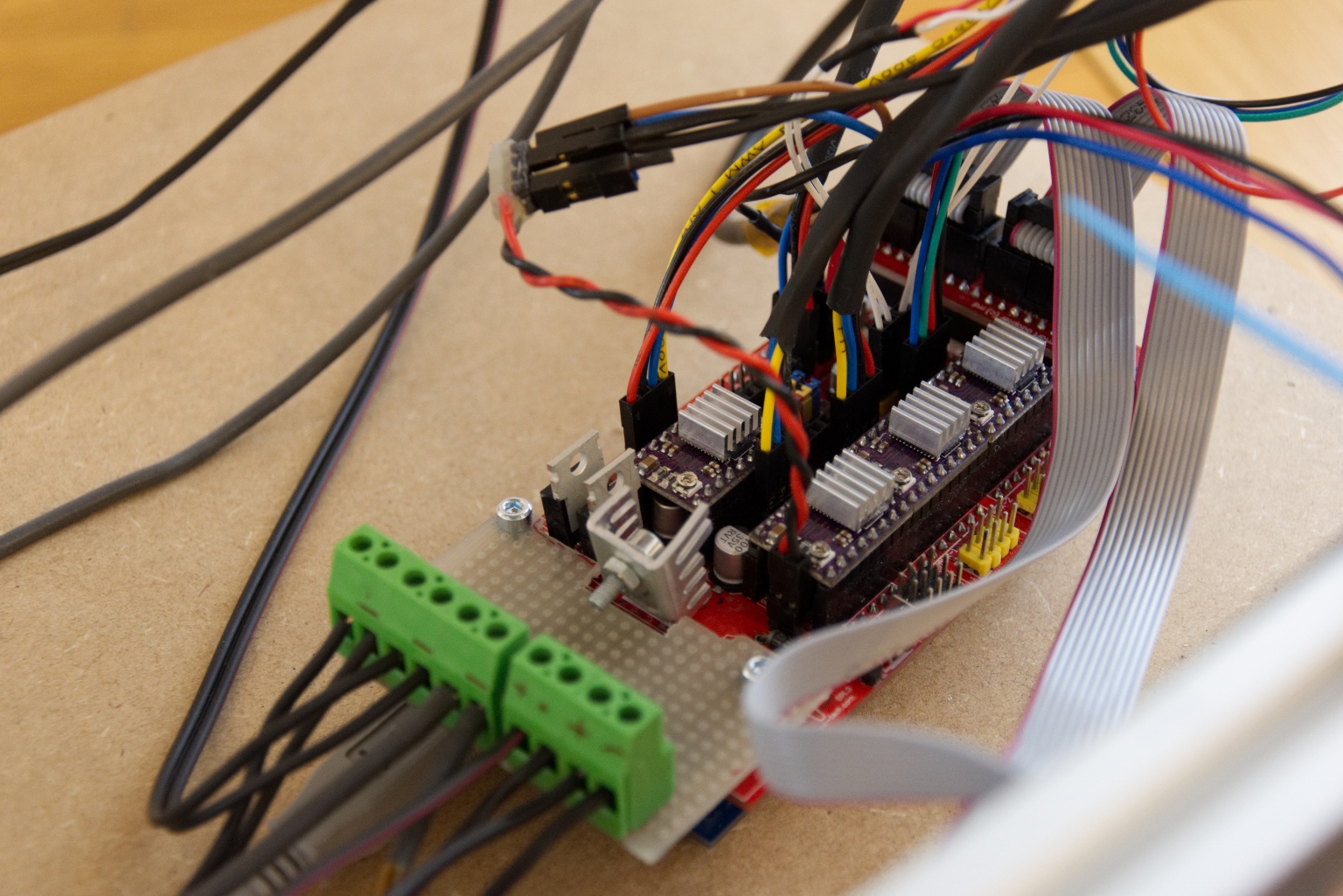 Největší komplikací v cíli byl RAMPS. Ale za to si asi mohu sám. Neměl jsem na něj vůbec sahat :). Vyměnil jsem tam MOSFET pro heatbed a jednou při nahrávání nového FW se částečně otevřel a vyhořel. Nové svorkovnice se tam pořádně nevešly atd. Na fotce je vidět mé řešení. Ten MOSFET mě mrzel. Vzhledem k tomu, že stál 86kč a to je skoro cena RAMPS. Nemluvě o času.