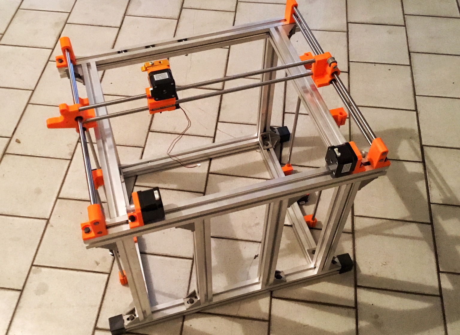 Zkousim udelat vlastni kostku na tisk. Osa Y a Z dva motory, osa X jeden motor. Motor X budu vozit po ose Y, coz je nevyhoda a jeste motor k extruderu pojede na voziku. Premyslim o predelani, kdy motor k extruderu bude na ramu pevne. Zatim mam zesilene pojezdy, tak se to neprohyba, ale ukaze az prvni tisk. Osa Y ma dva motory, ktere budou na druhe strane pohanet prubeznou osu 5mm, na ktere budou pouze kladky. Pokud to dobre seridim, snad to nepujde do krize. Zatim to je naprosto rovne a vse chodi. Jeste tam jsou mista, ktera chce upravit, ubrat nebo pridat material, ale uz to jsou jen male dodelavky. Plocha pro tisk bude 30x30cm, ale je tam mista i na 40x40 cm. Casem to bude zakryte a mel by tam byt pri dobrem nastaveni dostatek prostoru i pro filament kerou elektroniku. Nejspise to zabuduju do krabice s hlasicem pozaru :). Konstrukce je samonosna a muze byt i uvevnena na zdi a podobne. Tak snad to bude fungovat.