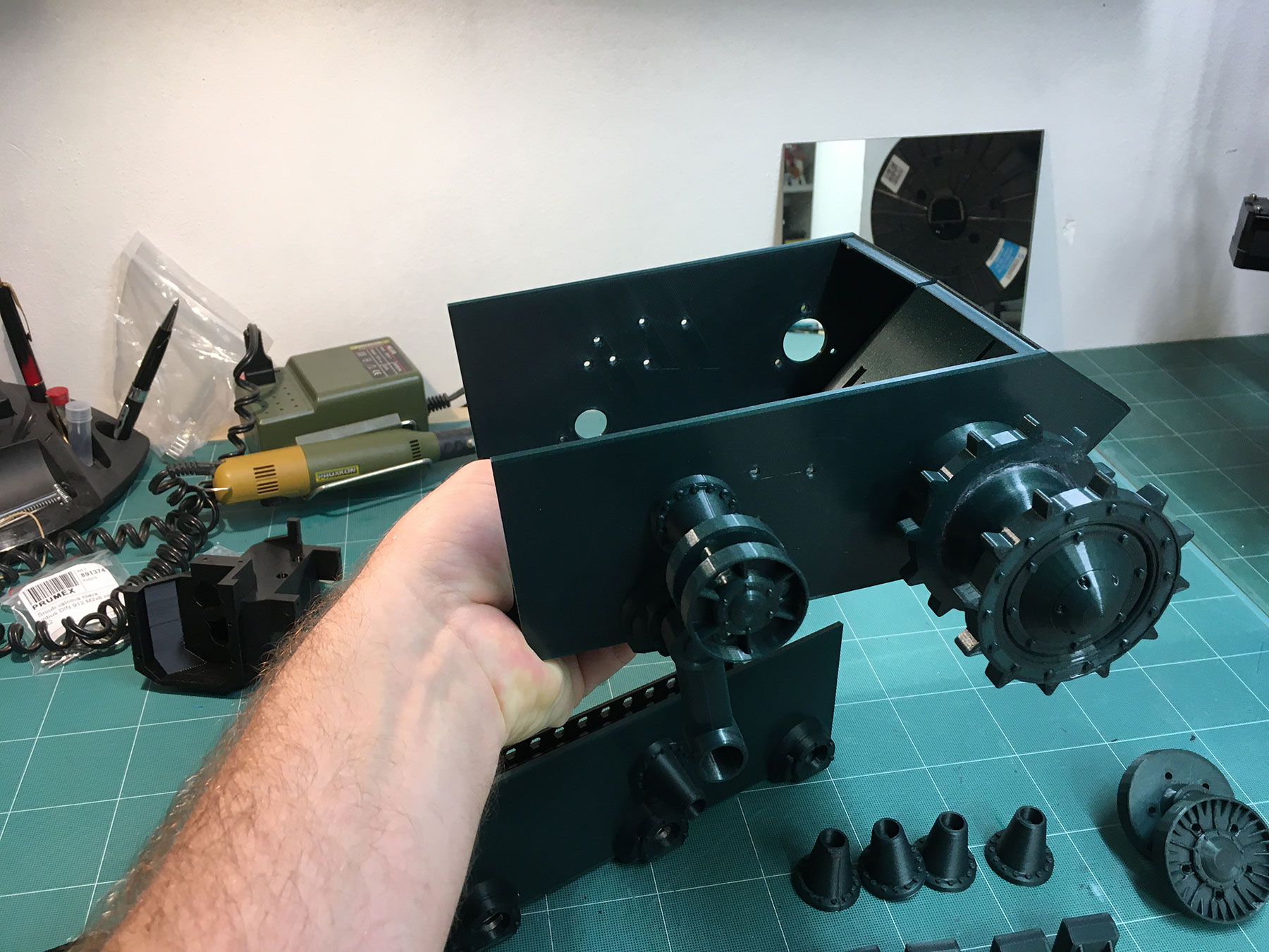 Už jsem protiskl 60 hodin a mám pár věcí. Bohužel musím počkat na ložiska, číňan občas udělá lehce jiný rozměr, tak abych to tam pak napasoval.