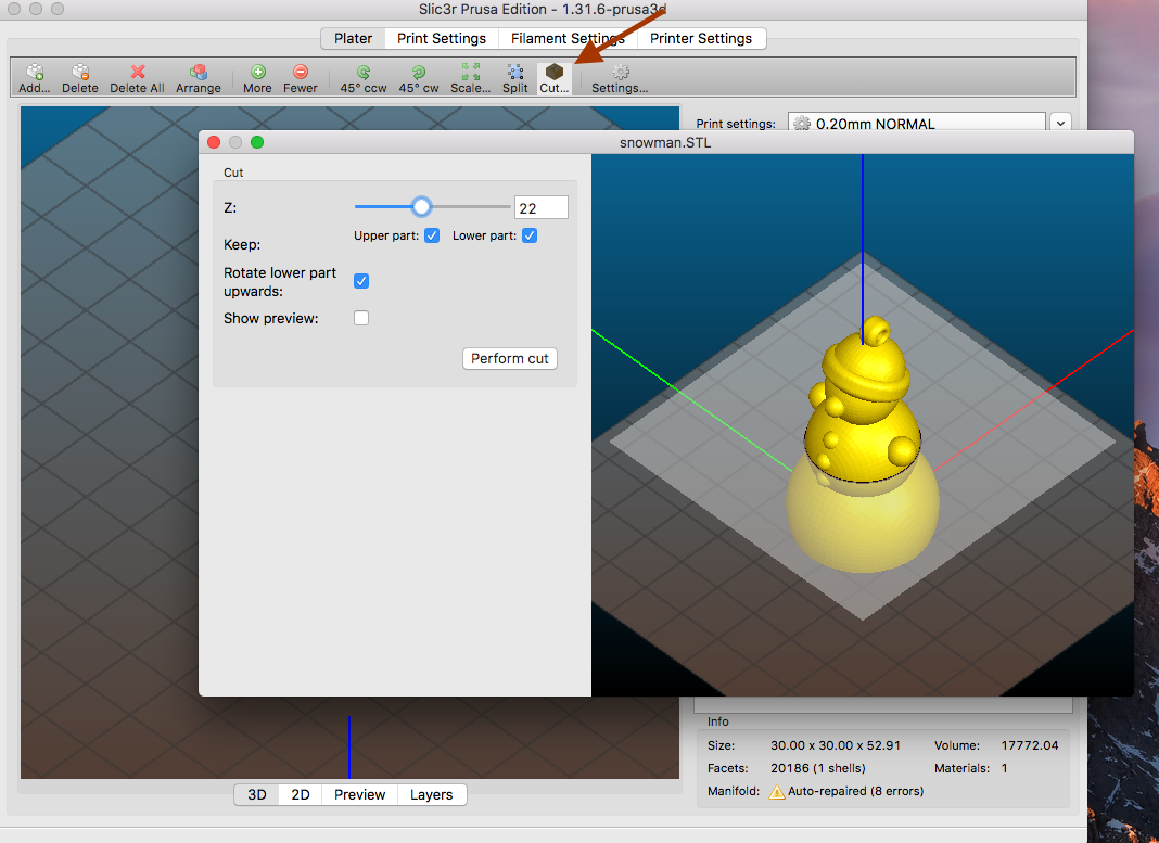 kroxigor píše:Ano jde to dokonce i přímo ve Slic3ru (na liště máš tlačítko Cut...)