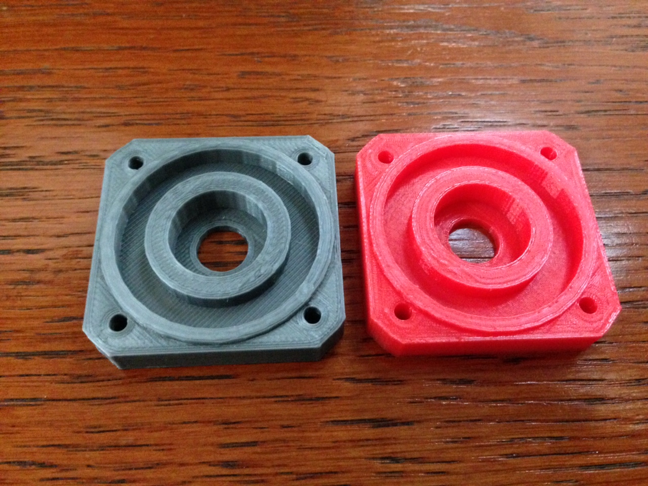 Červený a modrý díl před upgradem, stříbrný po. Zapadne to do sebe ztuha, ale jde to. Dobře je vidět, jak je STL model hranatý - málo detailů. Poslední Slicr a Repetier Mac.