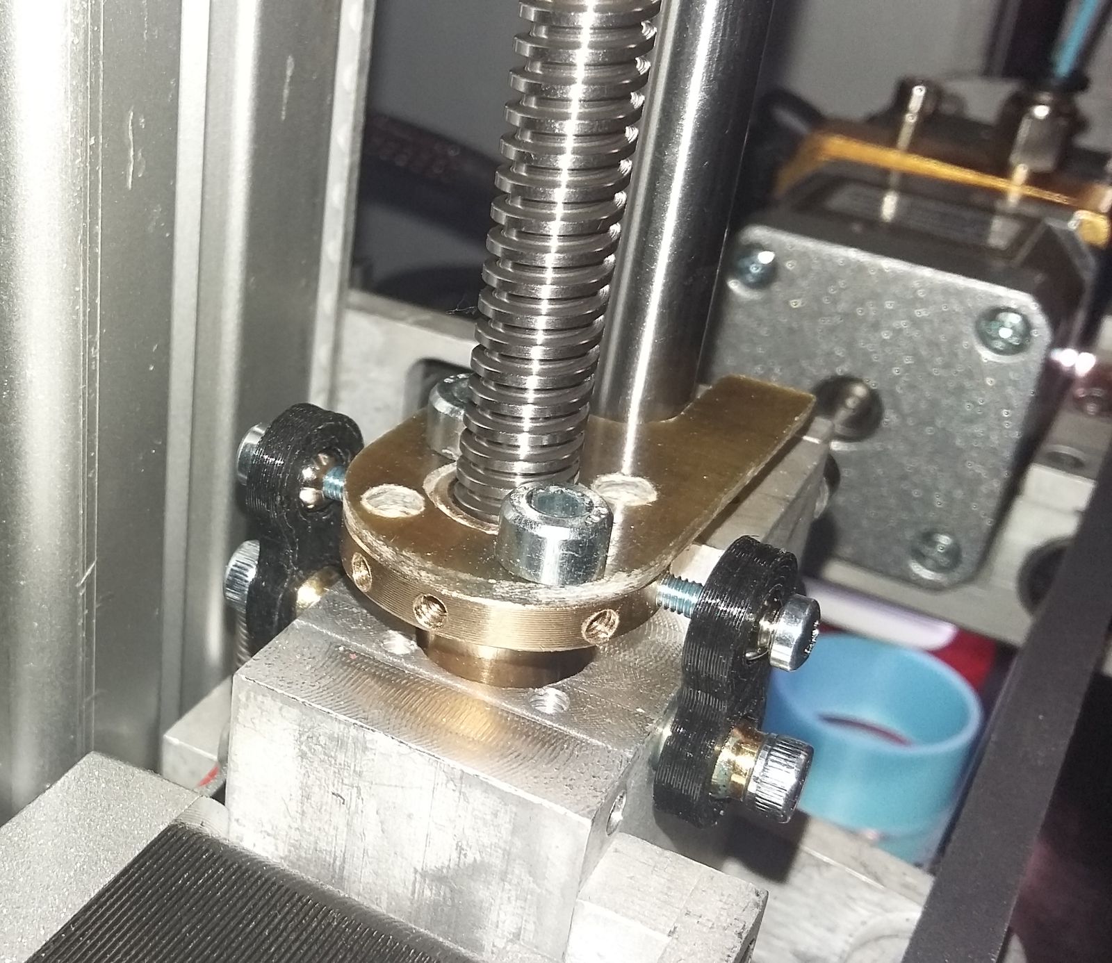 Stále mám (možno mylný) dojem, že horným uchytením závitovky len zvýšim prenos krivosti závitovej tyče na tlačený výrobok. Osobne mám uchytenú závitovú tyč len v pružnej spojke potom v matici Z posuvu a horná časť sa veselo voľne krúti. Za pohyb po Z ose zodpovedajú jej vodiace tyče bez násilného vnášania krivosti závitovky do systému. Netvrdím, že je to najlepšie riešenie, ale zdá sa mi to účelnejšie ako horné uchytenie.