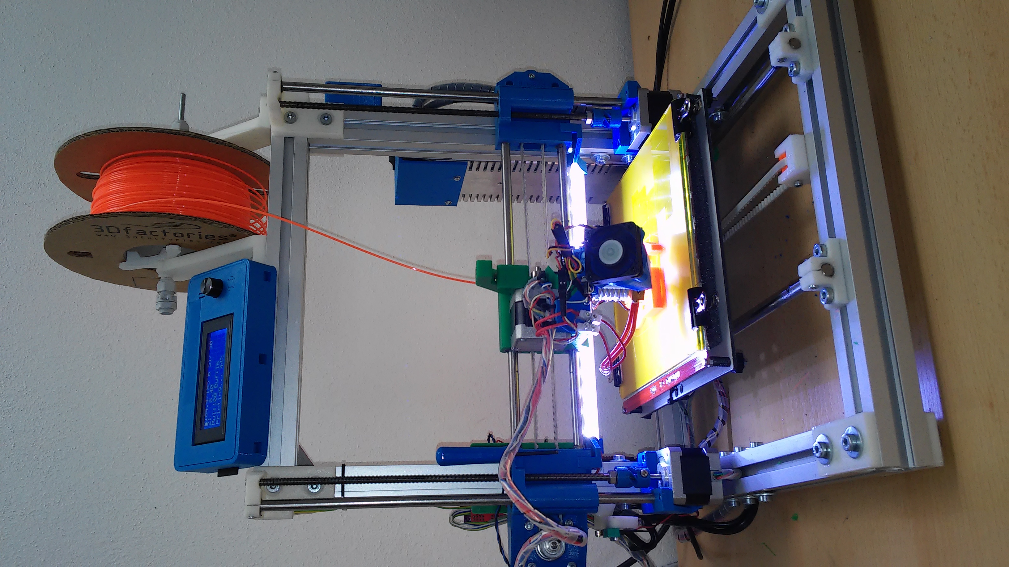 No já jsem tak dlouho spekuloval jak dát pásek abych dobře viděl na tisk, až jsem ho nalepil zespodu na držák hotendu a protože jsem moc líný, tak napájím přes původní větrákový výstup. Překvapilo mě jak těch pět ledek svítí