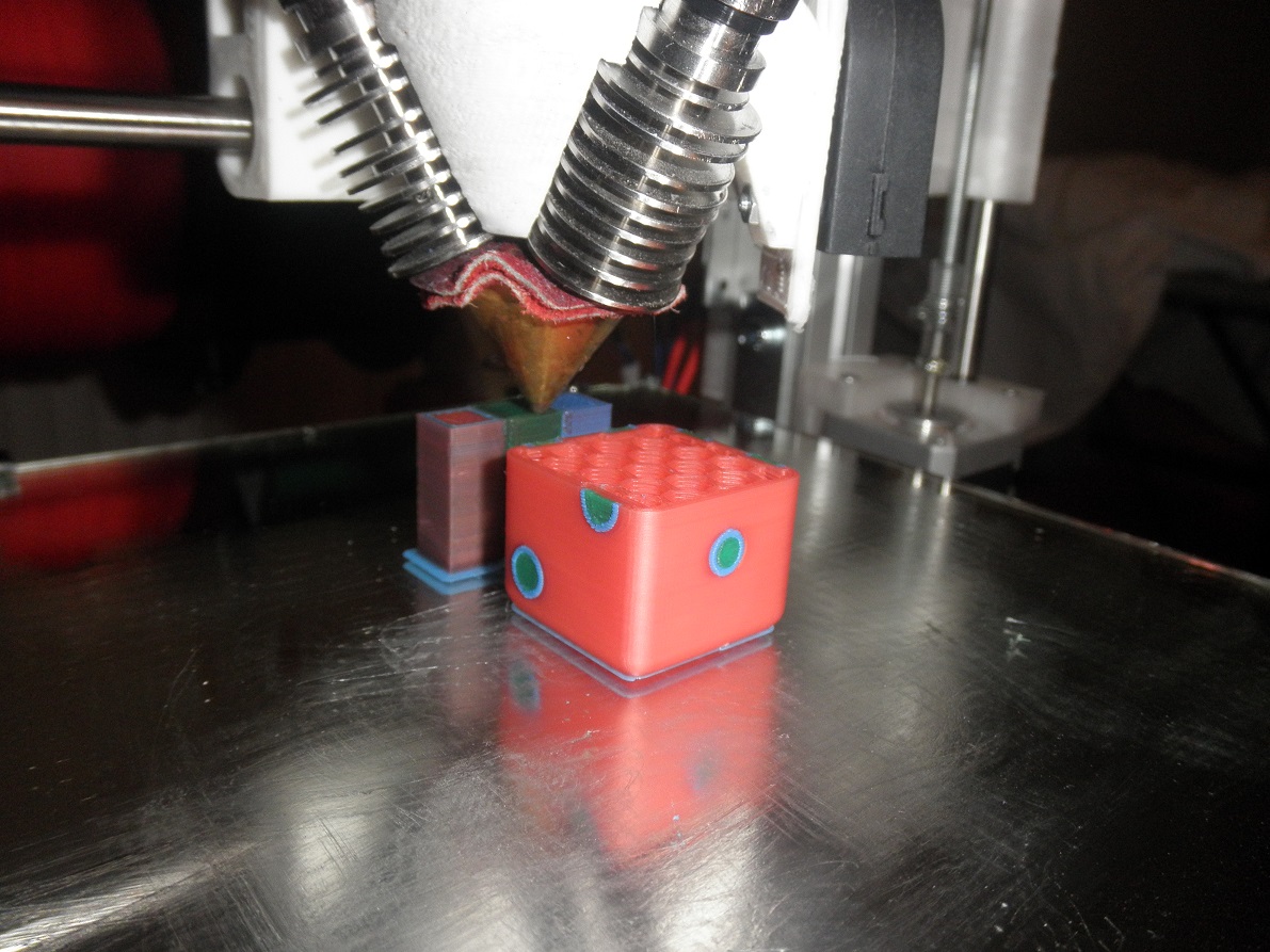 Právě jsem dokončil přestavbu Rebel II HD na použití mixing extruderu Diamond Hotend (http://reprap.me/diamond-hotend) a funguje to! Dnes jsem udělal první tříbarevný tisk, ale více mixovaných barev (filamenty CMY budou příští týden) na sebe snad nenechá dlouho čekat.