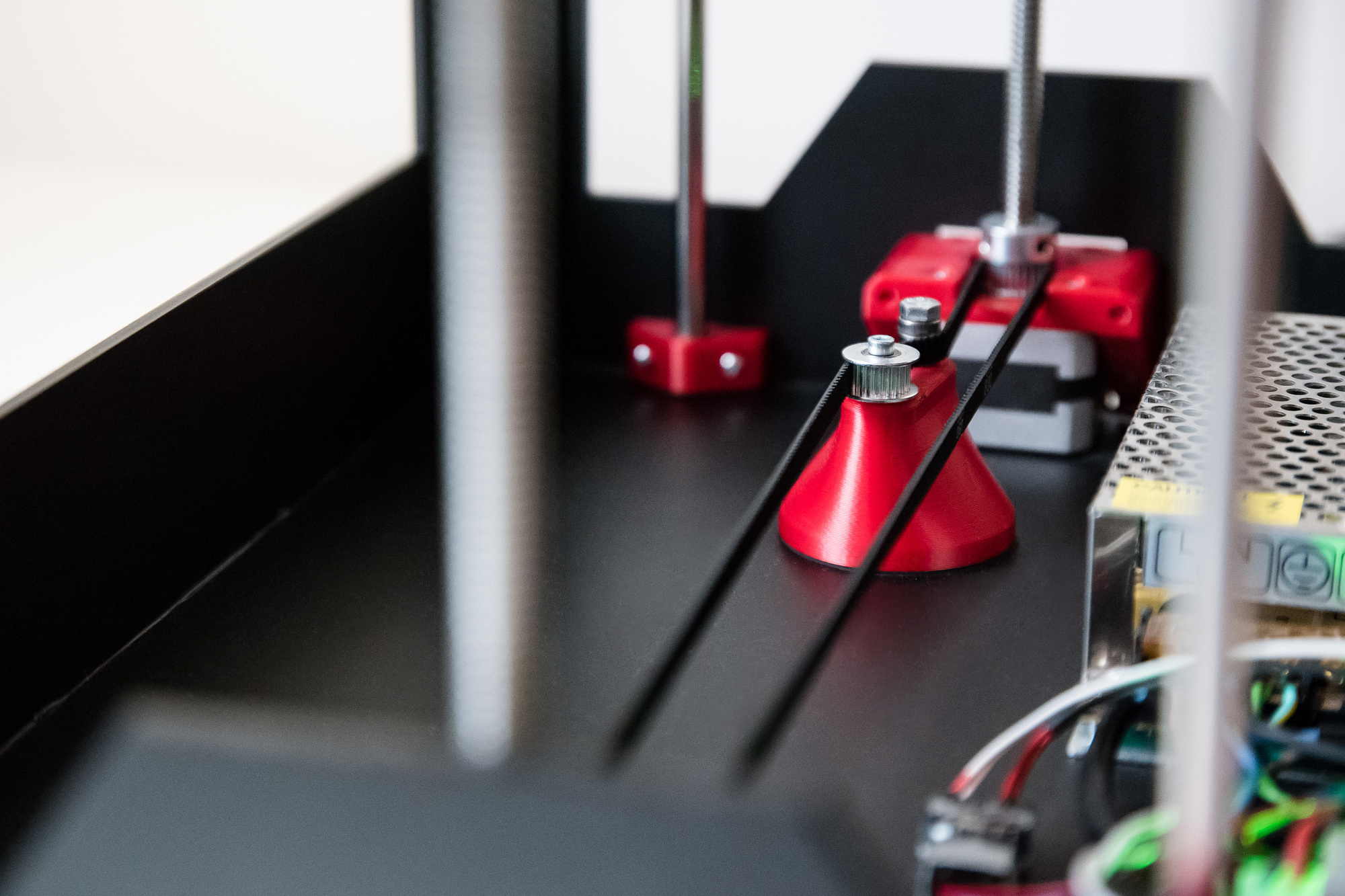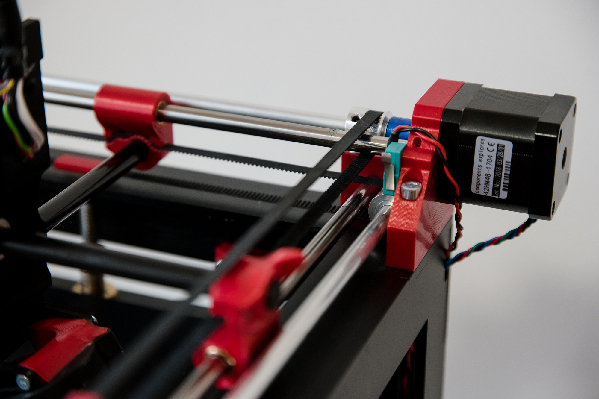 Mechanismus tiskárny je podobný jako u ultimakeru, byly ale přidány dvě hnací hřídele, nelíbí se mi totiž otáčení vodících tyčí u původního mechanismu. Řemenice na opačných stranách jsou na kluzných pouzdrech.