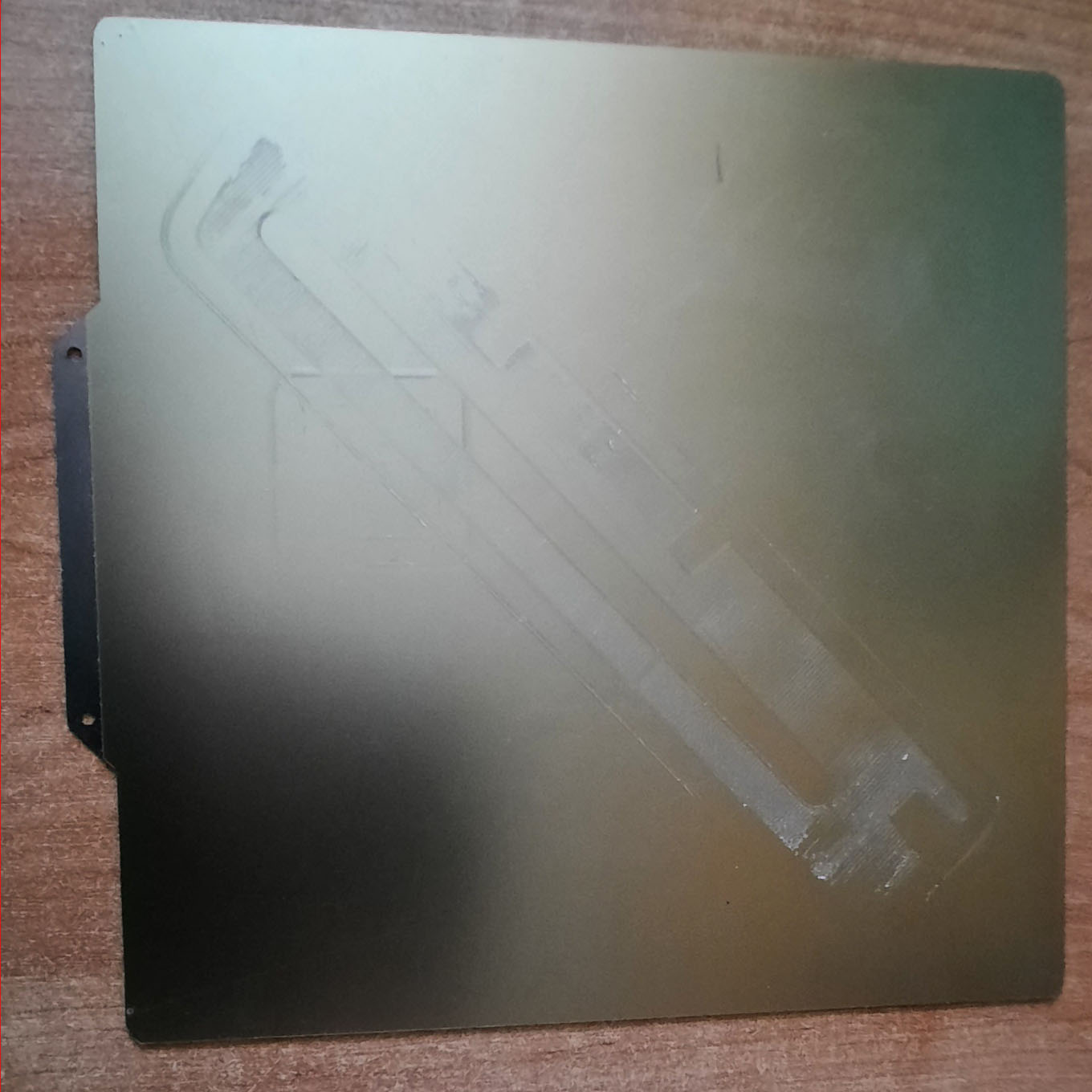 Ahoj žluta povrchová úprava je na plechu ale promiň na těch fotkách je to díky světelnému zkreslení špatně vidět je to něco jako tmavší mosaz. Ta struktura nahrazuje pravděpodobně práškový povrch jako u Průši na plechách ten plech je tímto oboustranný jinak máš pak hezky rastr na spodní straně výtisku. Co se týče strháváni magnetické folie tak tím jsem si taky stihl projít nahřál jsem stolek na 120 stupňů vzal špachtli a už to jelo jinak zbytky lepidla jsem potom umyl toluenem