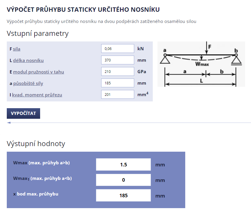 Bohužel nemám ocelové tyče stejné délky, takže výsledky se nedají porovnat přímo. Z naměřeného průhybu ocelové tyče jsem ale dopočítal prohnutí, které by měla ocelová tyč o délce 400mm. Vyšlo mi 1,9mm (těch 30mm udělá překvapivě dost).