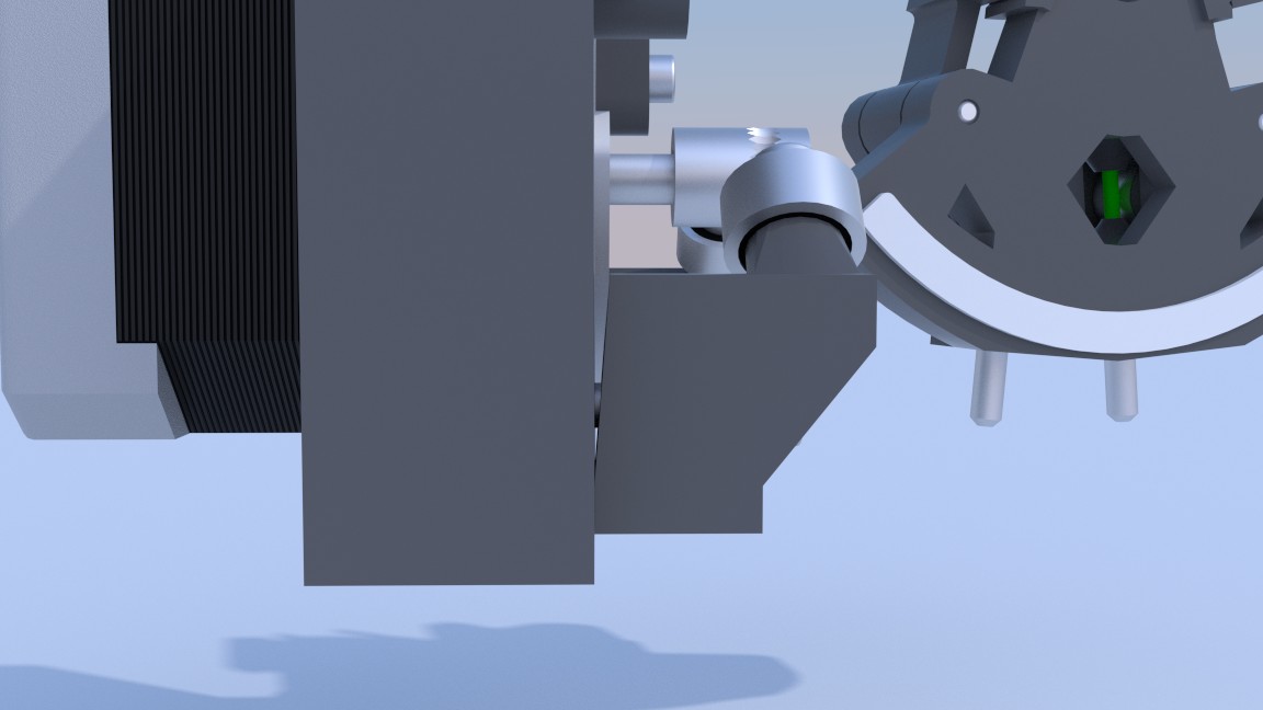 Tady je pohled na kontaktní místo mezi držákem a kolébkou. Jsou zde vidět kluzné vložky, které bych asi vyděl zhotovené buď z nylonu (možnost tištění) nebo z PTFE (teflonová deska a vystřihnout si je). Jsou v místě, kde jsou vymezovací ložiska.