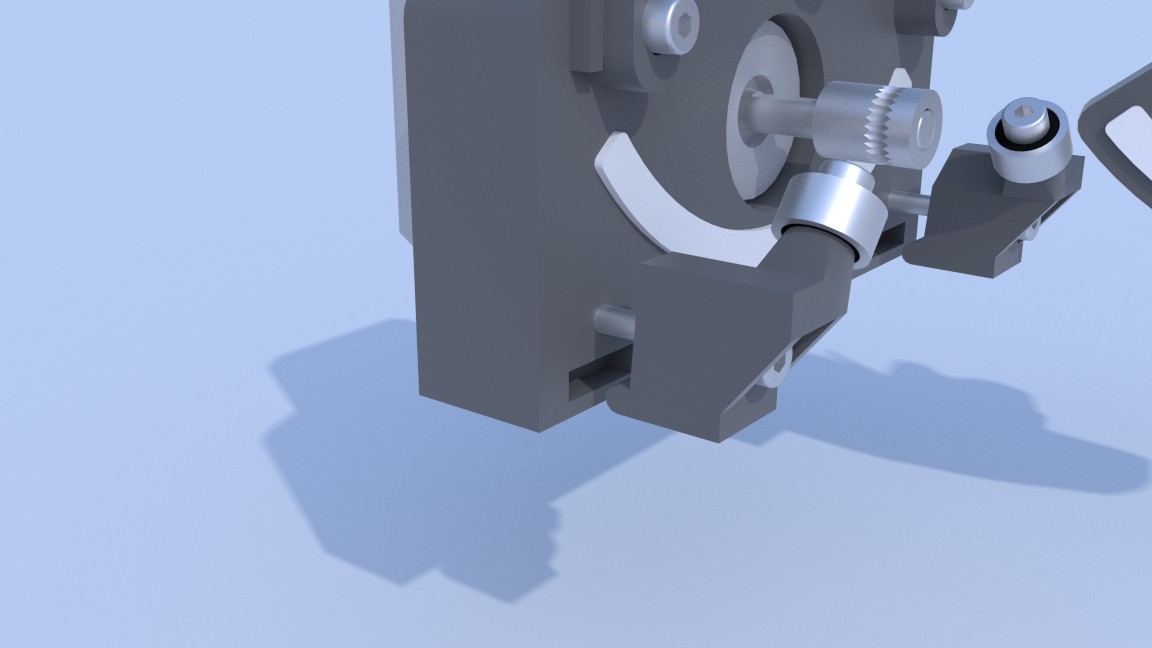 Páčky s ložisky, přidržující filament, jsem navrhl bez pružin, jelikož už se tam nevejdou. Navrhl jsem proto jiné řešení a to, že přítlak a napružení páčky bude prováděno pomocí klínu (na obr chybí zatím), který se strčí mezi páčku a kolíbku. Klín bude vroubkovaní a ještě bude mít v kolíbce drážku (nebo bude mít z boku náběhy), takže by se neměl samovolně uvolnit. Ještě není na obr protikus na držení extruderů.