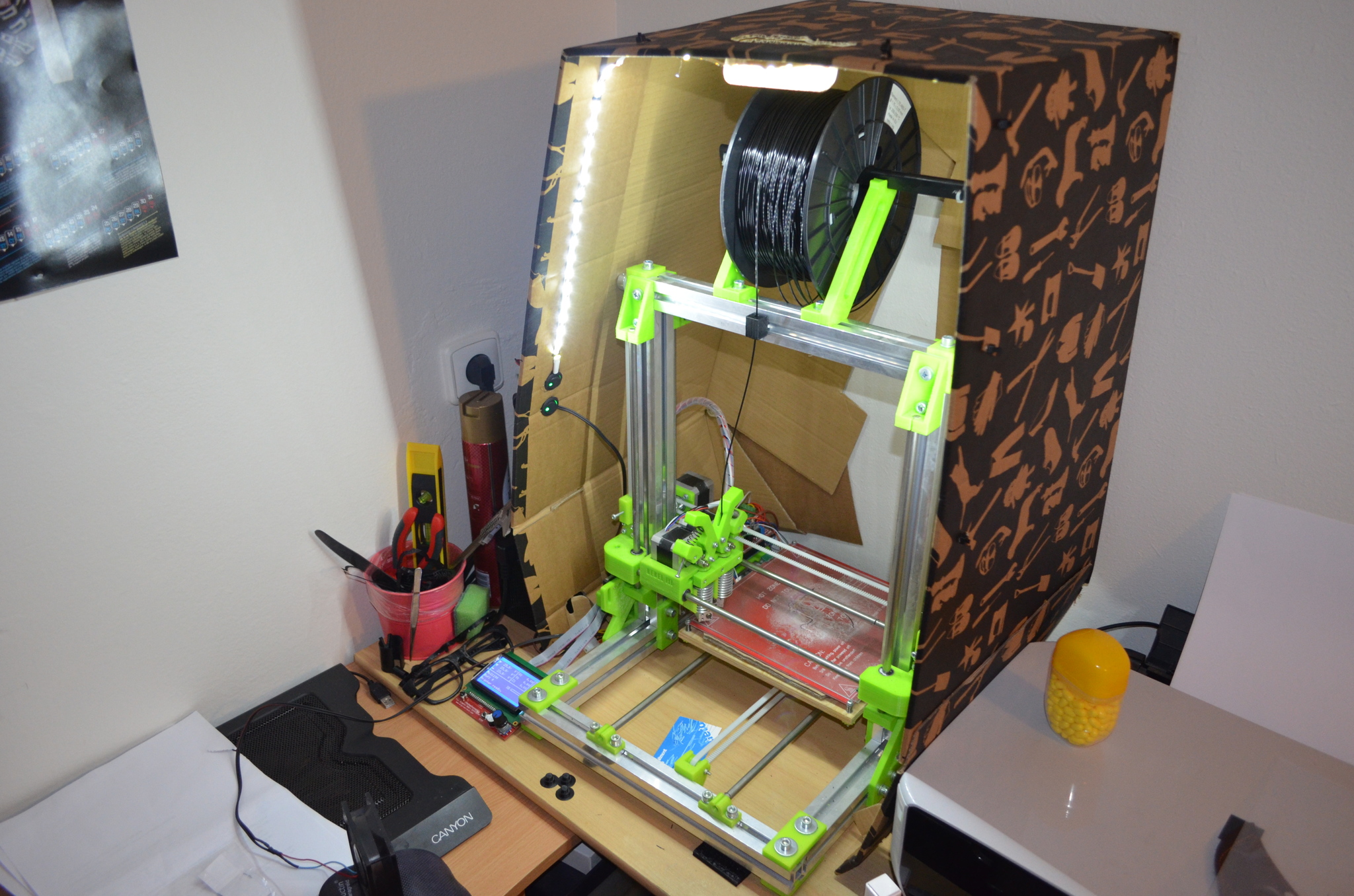 Taky nechci rejpat, ale též bych byl opatrný. Ideální mi na box na tiskárnu přijde sádrokarton. Je to nehořlavé, laciné, hezky to vypadá a skvěle opracovává.