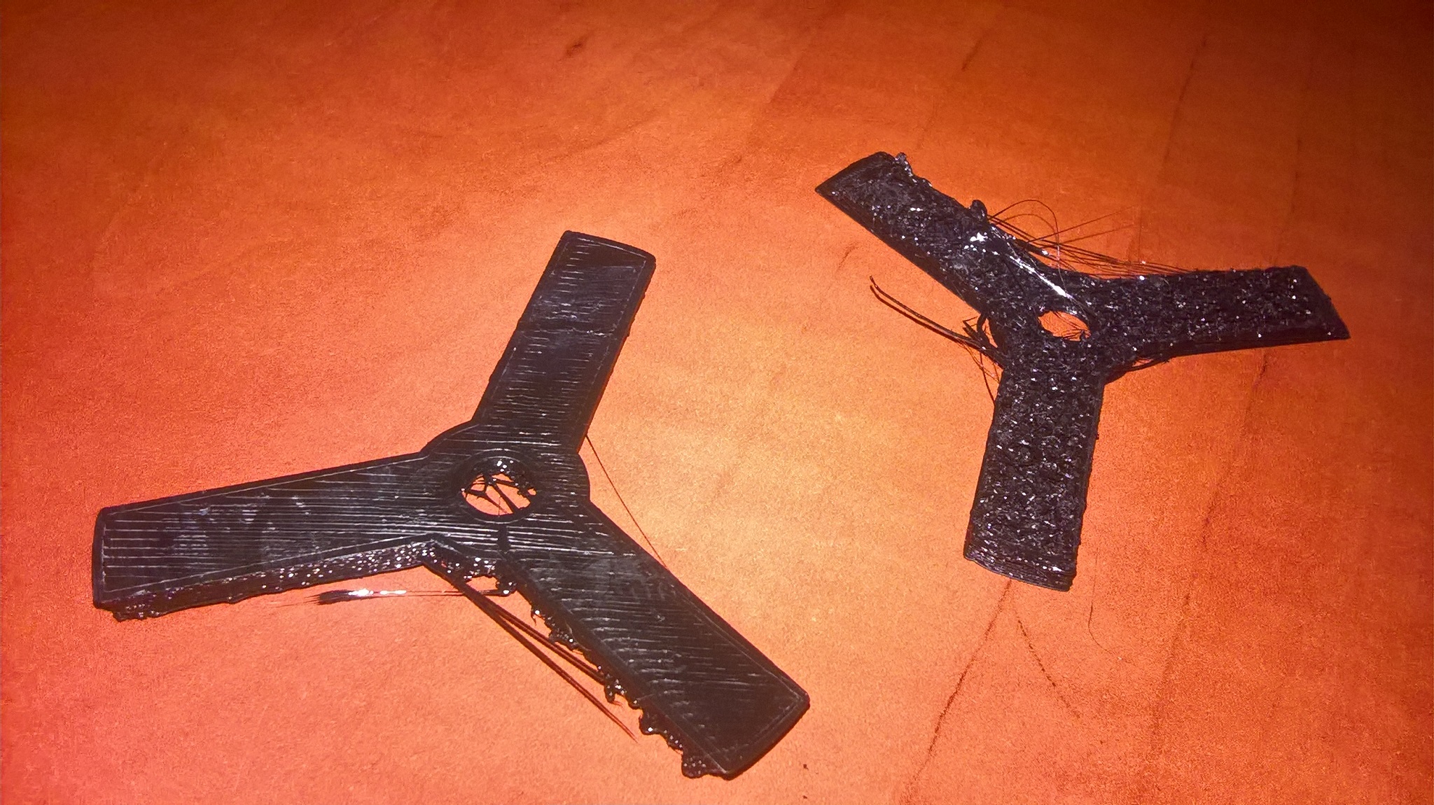 Vlevo je originál, vpravo výrobek (zespoda je tam docela velký most, stejné velikosti jako prolis zvrchu. Udělal jsem pod něj podpěry, mezera 0.4mm).