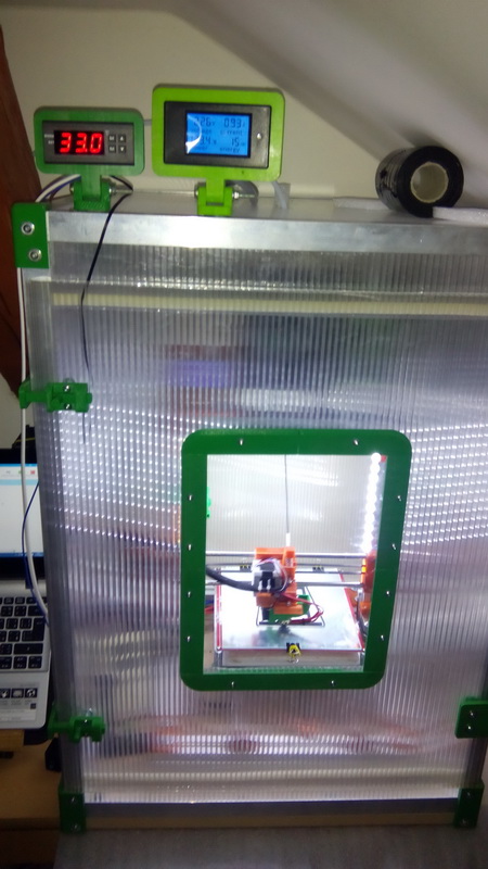 Můj temperovaný box pro REBELA. Temostat udržuje teplotu v boxu na 40stupňů a od té doby žádný prasklý výtisk. Použitý materiál Lexan 10mm a hliníkový jekl 25/25.