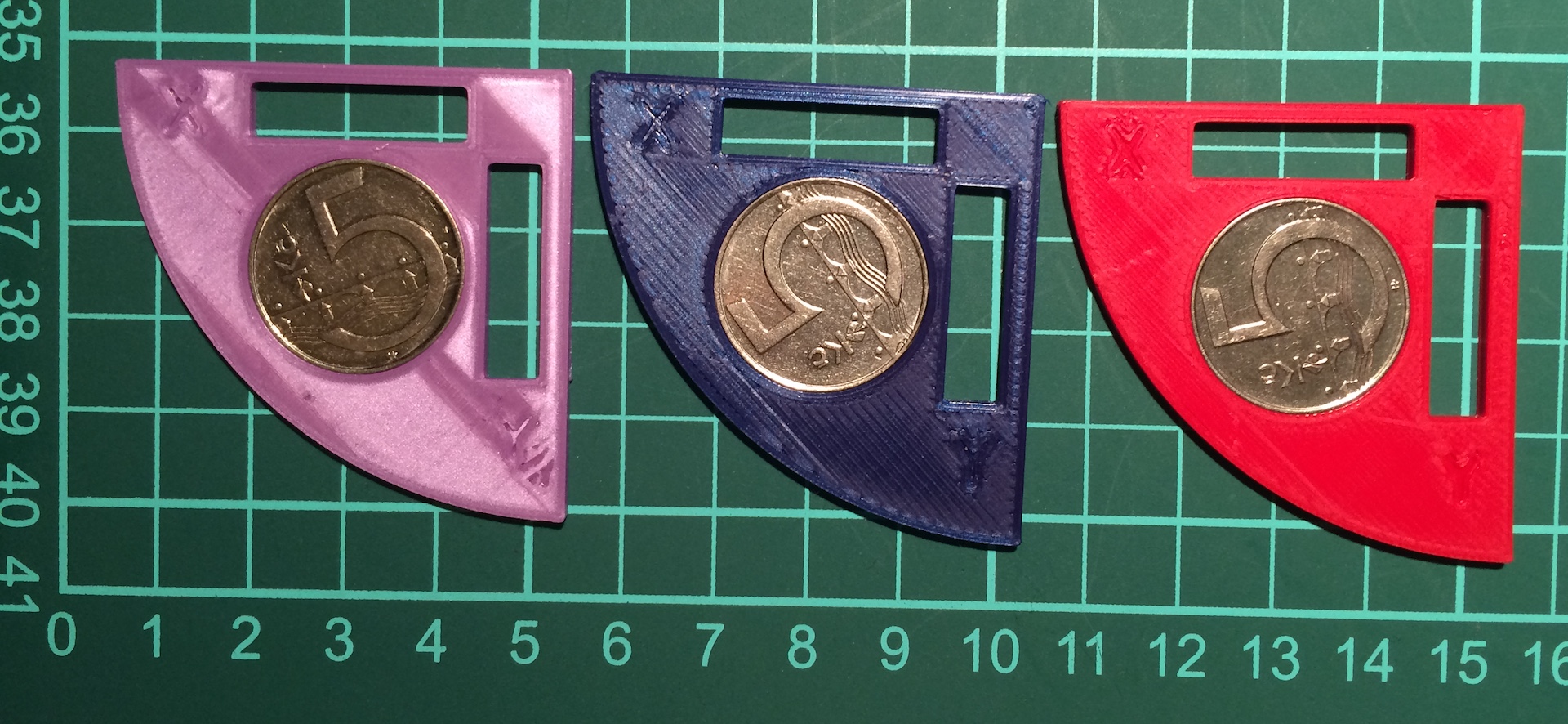 Tak já nevím, extruder jsem zpřesnil (dával o 0.6mm víc) a stejně mám někde chybu. 5-ti koruna projde akorát, ale vnější rozměr je velký.