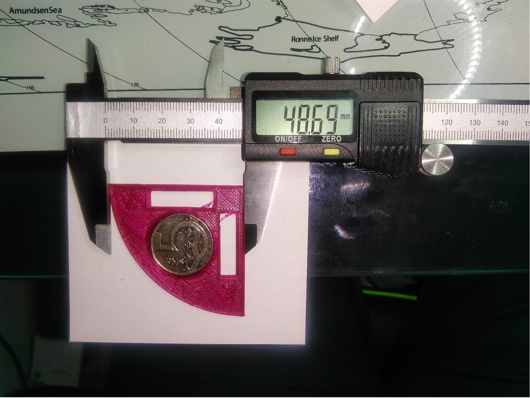 Dovolím si přidat vlastní kalibrační pomůcku na 5Kč. Udělal jsem ji čtvercovou aby se vnější rozměr dal měřit od hrany k hraně. Přece jen na těch rozích mohou vznikat lehké přebytky materiálu, které by pak mohly zkreslit měření.