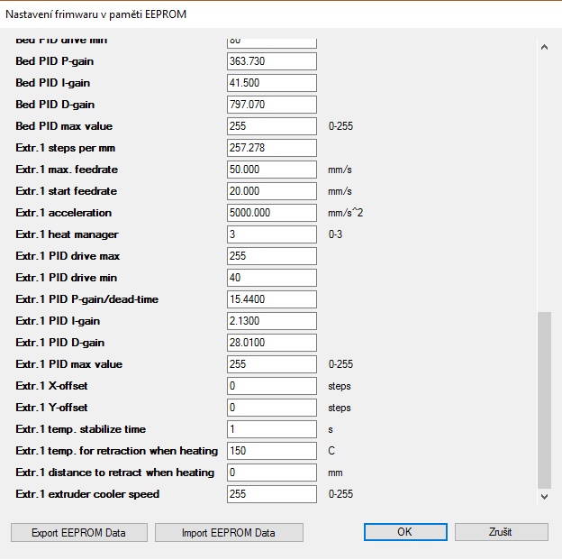 Použité hodnoty byly 100 a 180°C. Vše s následujícími hodnotami EEPROM. Jen druh regulace jsem přepínal pomocí displeje.