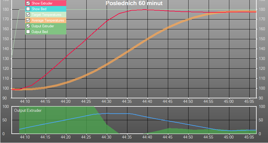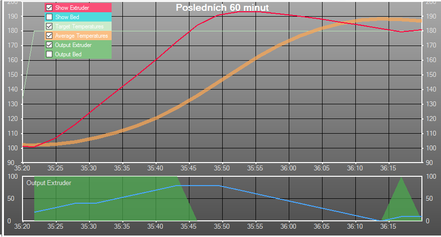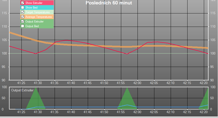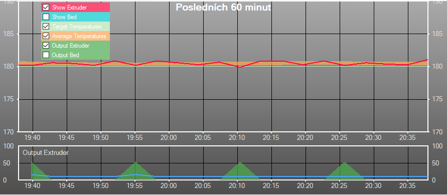 Protože si myslím, že by bylo fajn vidět, jak fungují jednotlivé druhy regulace hotendu, dovolil jsem si udělat jejich přehled vč. grafů z Repetier-host.