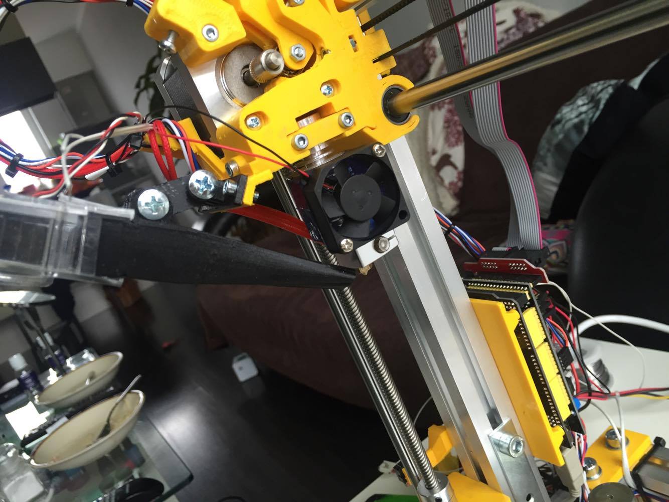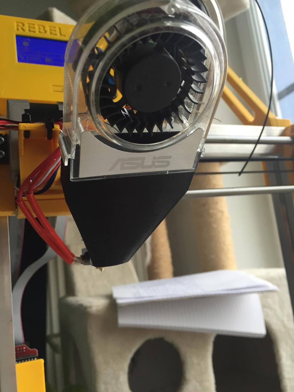 V reálu to vypadá takhle, chci to trošku ještě předělat abych se dostal víc ke trysce, ale to bude asi už jen pro můj dobrej pocit protože i takhle to funguje moc dobře větrák má výkonu dost. Jinak abych se trošku podělil tak jsem si na ali koupil ten silkonovej heatbed na 220V a sem moc spokojenej, kompletní nahřátí na HE 230C a HB 85 trvá cca 4min a to se nahřívá prvně HB a pak HE. A další výhoda kterou to má je, že mě stačí 100W zdroj na provoz celé tiskárny, takže vlastně člověk ušetří aji na penězích za zdroj. Celkovou cenou za celou tiskárnu se dostanu pod 5tisíc hravě což si myslím je dost slušný