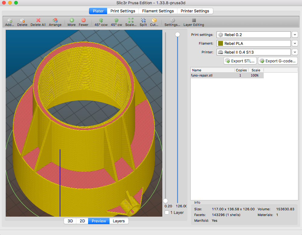 Pak jsem STL prohnal NETFABem a vrazil opět do toho samého Slic3r - a ejhle v náhledu paráda.