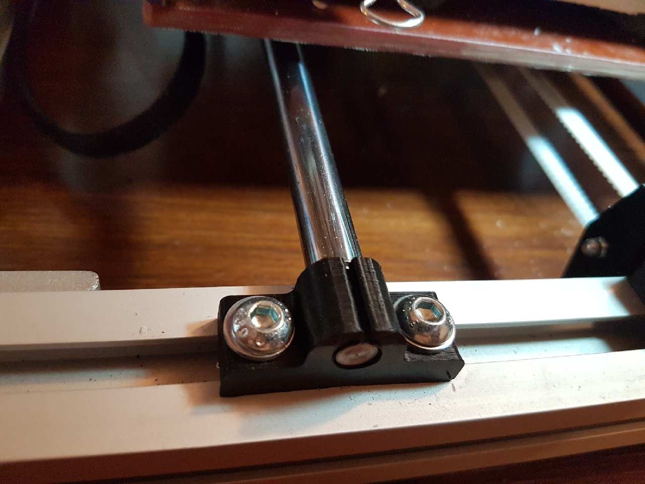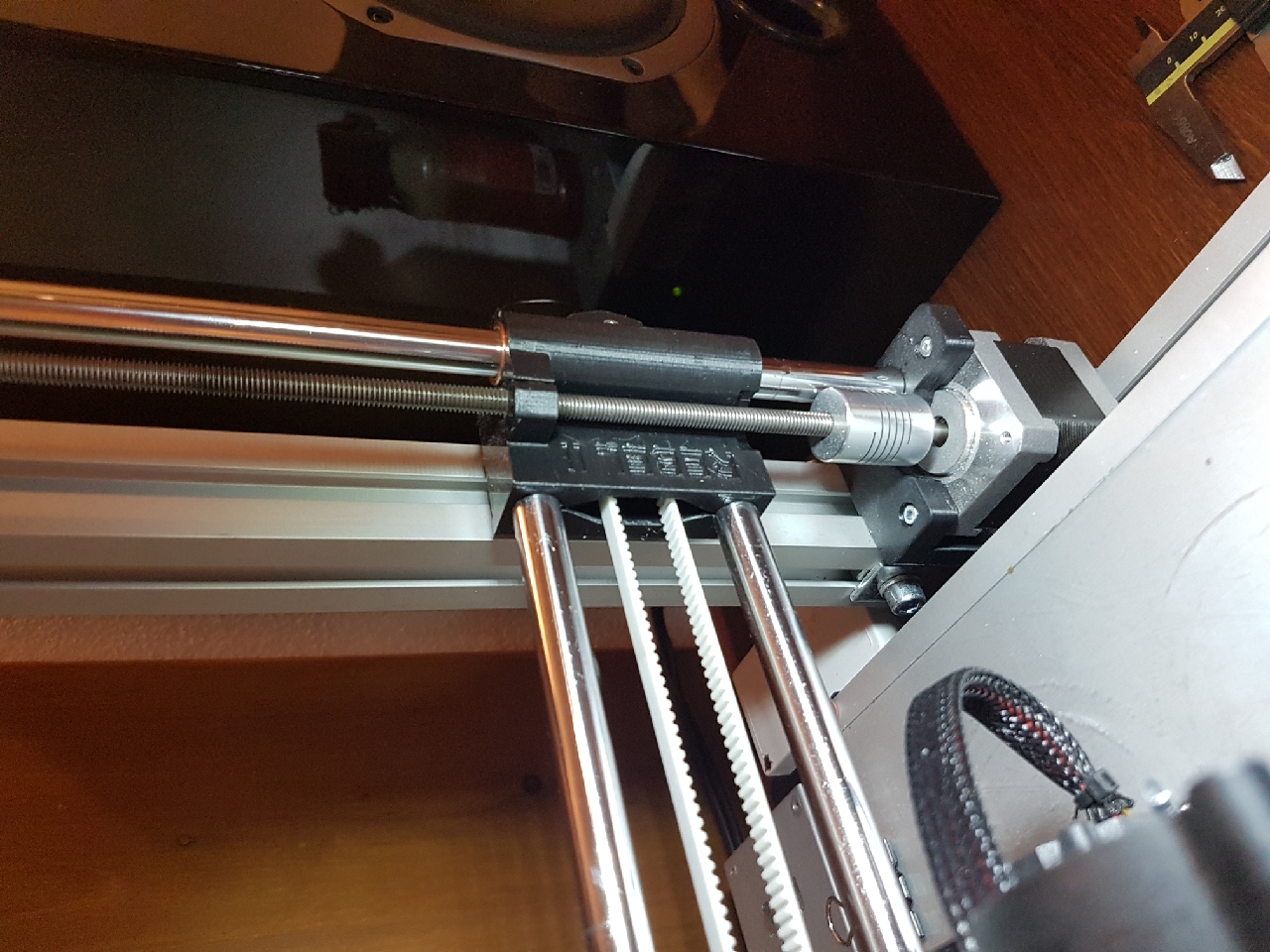 Jinak jsem si vždycky myslel, že tuhost konstrukce není u tiskárny moc důležitá..... opak je pravdou. Vyhodil jsem 8 mm tyče a osadil rebela tyčemi o průměru 11 mm s chromovaným, superfinišovaným povrchem, futra mám měděný s vnitřním teflonovým povrchem. Konce tyčí jsem osadil na pr. 8 mm a zachoval tak původní objímky tyčí. Lehce jsem naolejoval.