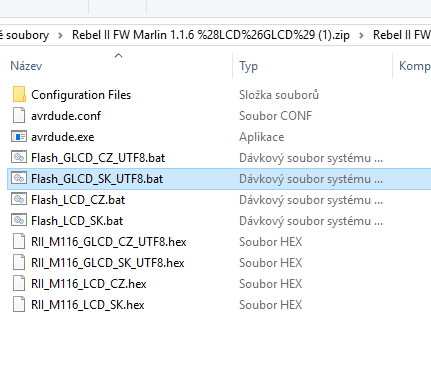 V prilohe binarne subory skompilovaneho firmwaru Marlin 1.1.6 pre Rebel II a jeho derivaty s grafickym, alebo znakovym LCD displejom.