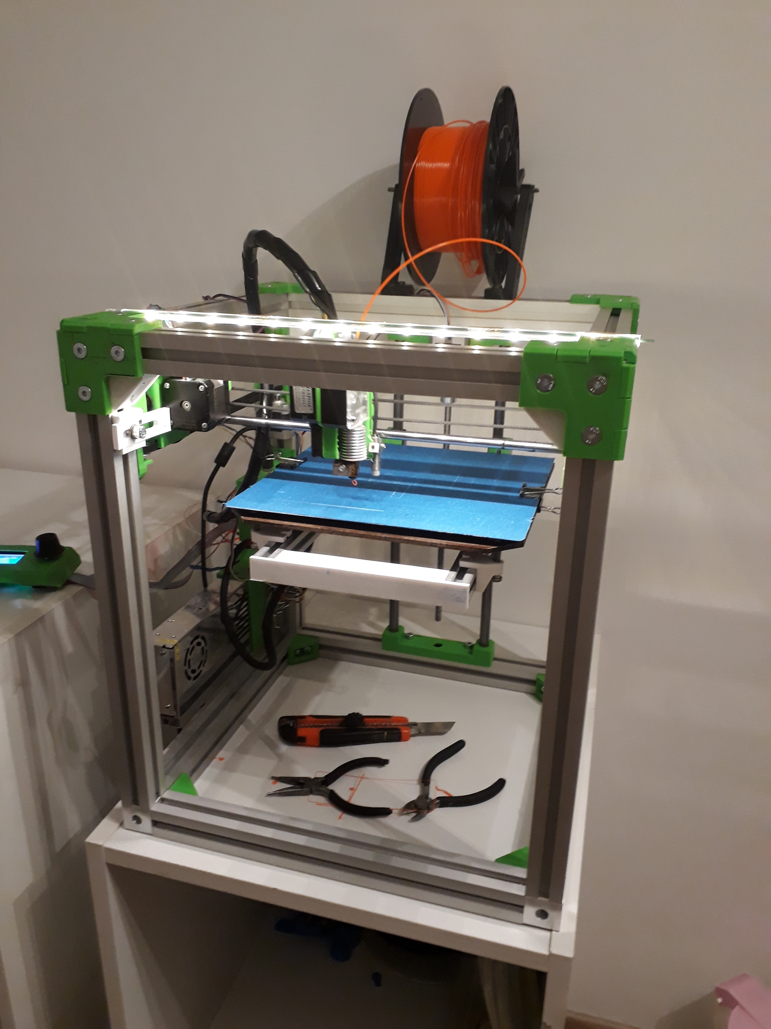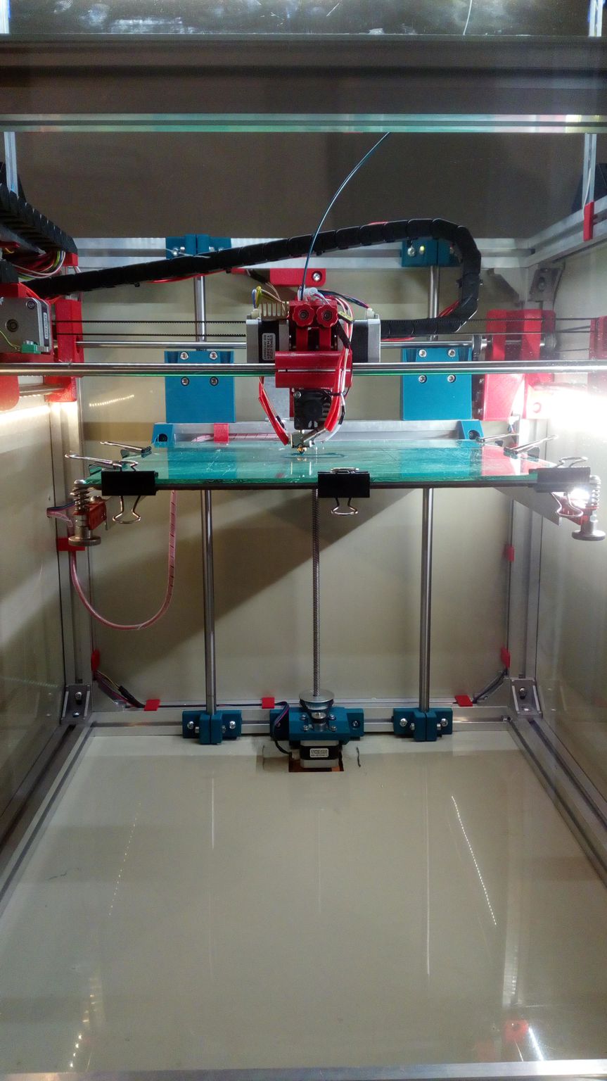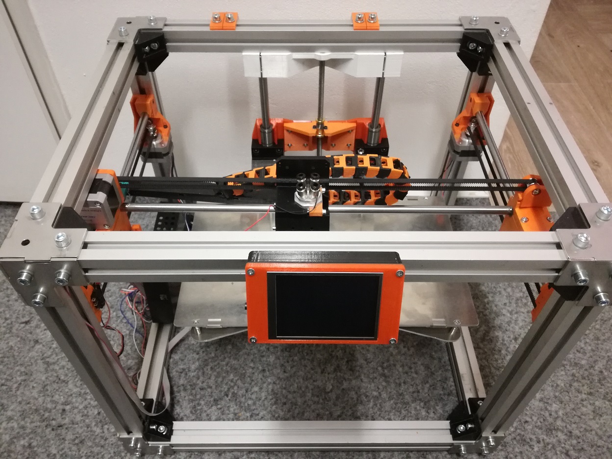 Jak píšu v jiném vláknu ohnedně ceny, tato moje kostka má zevní rozměr 500x400x500mm, stavěna pro heatbed 300x200mm. V této fázi stavby je odhad výšky tiskového prostoru okolo 26cm (musel jsem vypodložit motor a držák osy Z, protože 350mm trapéz který mám doma je kratší. 400mm trapéz už mám objednán, budu ho muset asi zkrátit - poradíte jak nejlépe a nejšikovněji? v domácích nestrojírenských podmínkách?)
