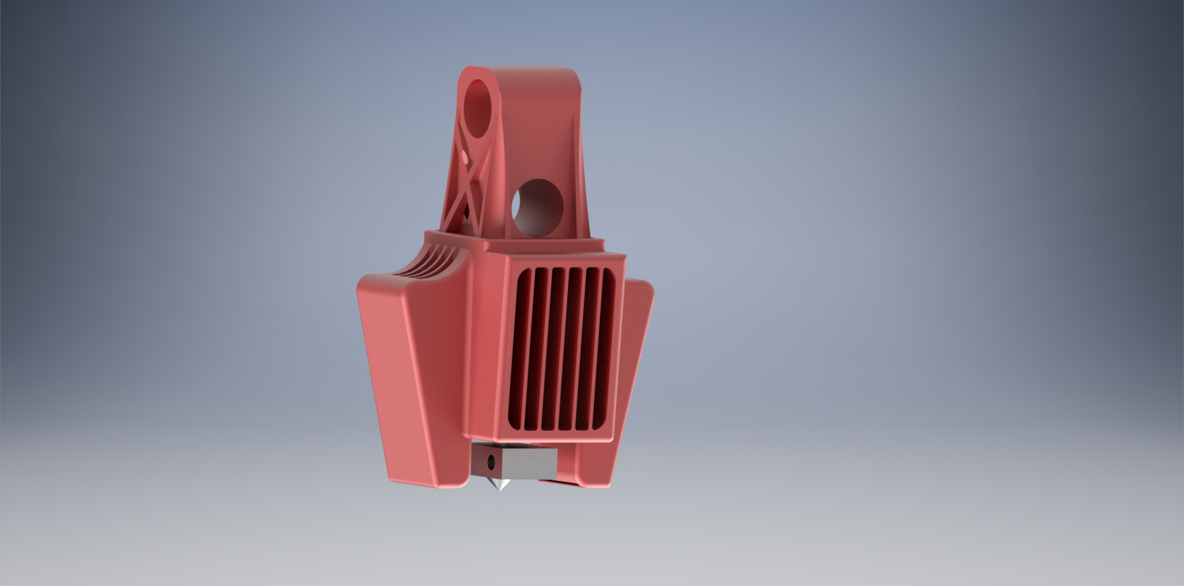 tady mám upravenej držák hotendu, na ofuk výtisku budou dva radiální ventilátory 30mm vloženy postranách a zepředu jeden axiální na ofuk hotendu