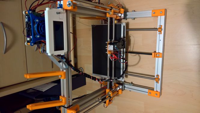 V jádru samozřejmě vychází celá konstrukce z Rebela II, resp. z Luboshovy verze Rebel II.c. Místo tisknutých spojek profilů jsem použil koupené rohové (corner bracket), vodicí tyče Ø 10 a v ose Z trapézové šrouby Ø 8 – ty jsem bral z Číny včetně matek. Na pohled vypadají dobře a tak i slouží, neměl jsem možnost je porovnat s kvalitními, doposud jsem nezaznamenal žádný problém.