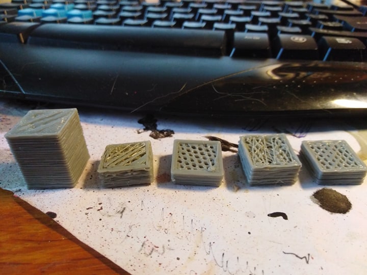 Na foto z leva: první dokončený objekt, a pak různé nedokončené zkoušena různá nastavení tisku atp.
