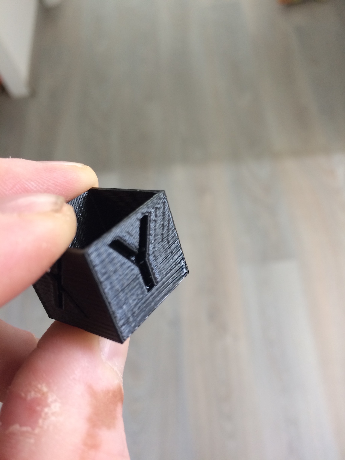 Po udrzbe na tiskarne (nove plastove dily drzaku Y + distancni sloupky bedu) jsem lehce dotahl remeny. Vytisk jsem kalibracni kosticku (bez horni uzavrene vrstvy). Velikosti sedi. Jen bych chtel od zkusenejsich nazor na ghosting. Na "X" to vypada temer super, na "Y" neco videt je.