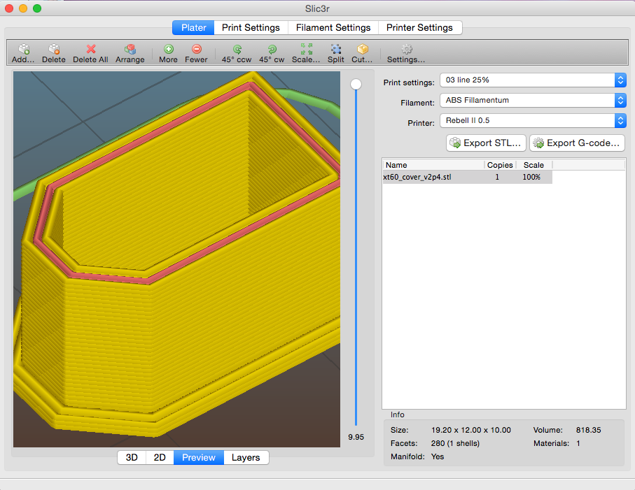 Slic3r 1.2.9 jsem vyřadil a vrátil se zpět, přeplňuje stěny kde mám 3 primery ( v prostředním perimetru cpe hodně materiály a chová se divně. Občas spadně, když generuju 2x stejný objěkt vyjde z toho jiný gcode.