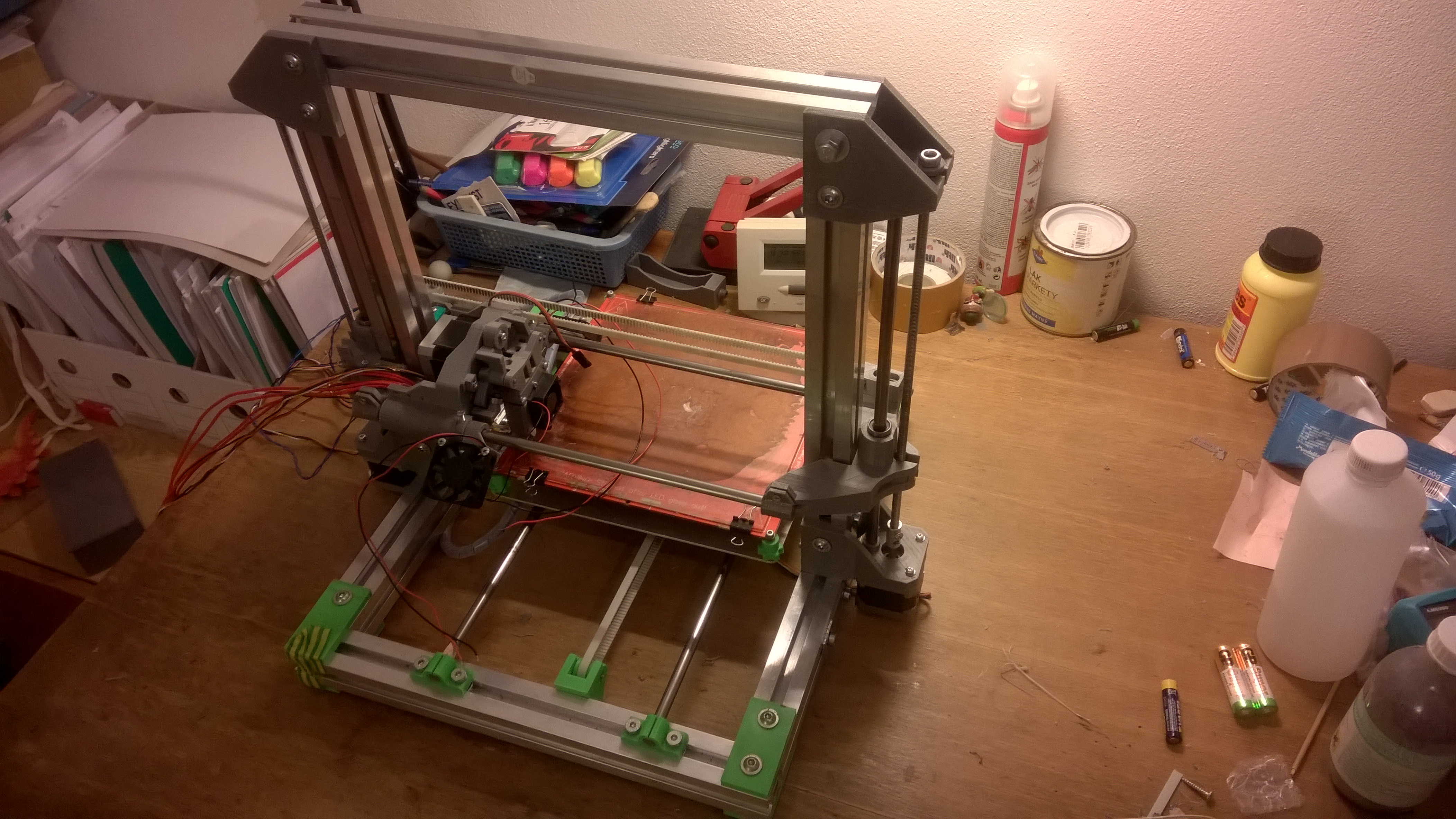 Takže dneska jsem začal provádět upgrade mého Rebela II. Všechny díly jsem byl schopný vytisknout, sice držáky osy Z na jednom místě praskly, ale prasklina neovlivnila zásadně pevnost dílu, zadělal jsem je ABS juicem. Při montáži jsem narazil na pár menších věcí, které v modelu budu ještě poupravit, aby montáž byla jednoduší (věci kolem lineárních ložisek). Jinak jsem už zapnul a nastavil servo ve firmware a odzkoušel naklápění extrudérů, které pracuje velmi slušně. Ještě jsem nezkoušel, zdali se mi správně točí motor extruderu, jelikož ještě nemám dodělanou kabeláž, ale podle mého by měl. Zde je fotka mého díla :) .