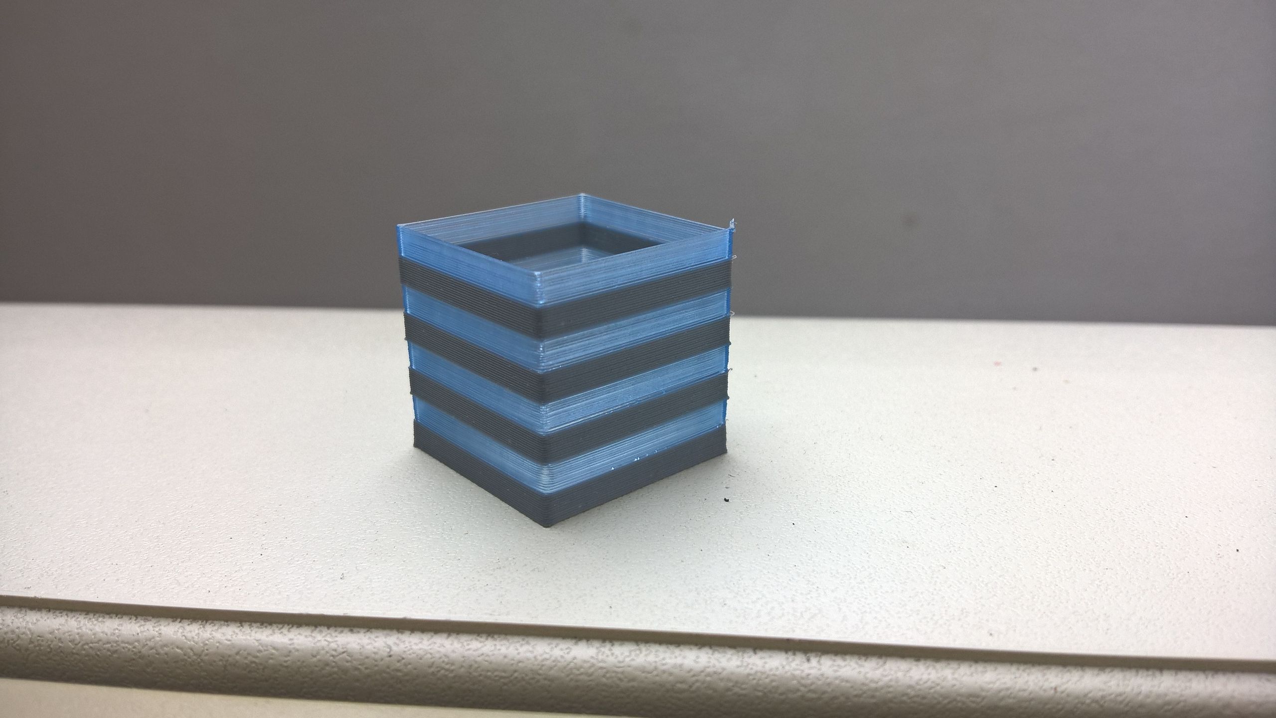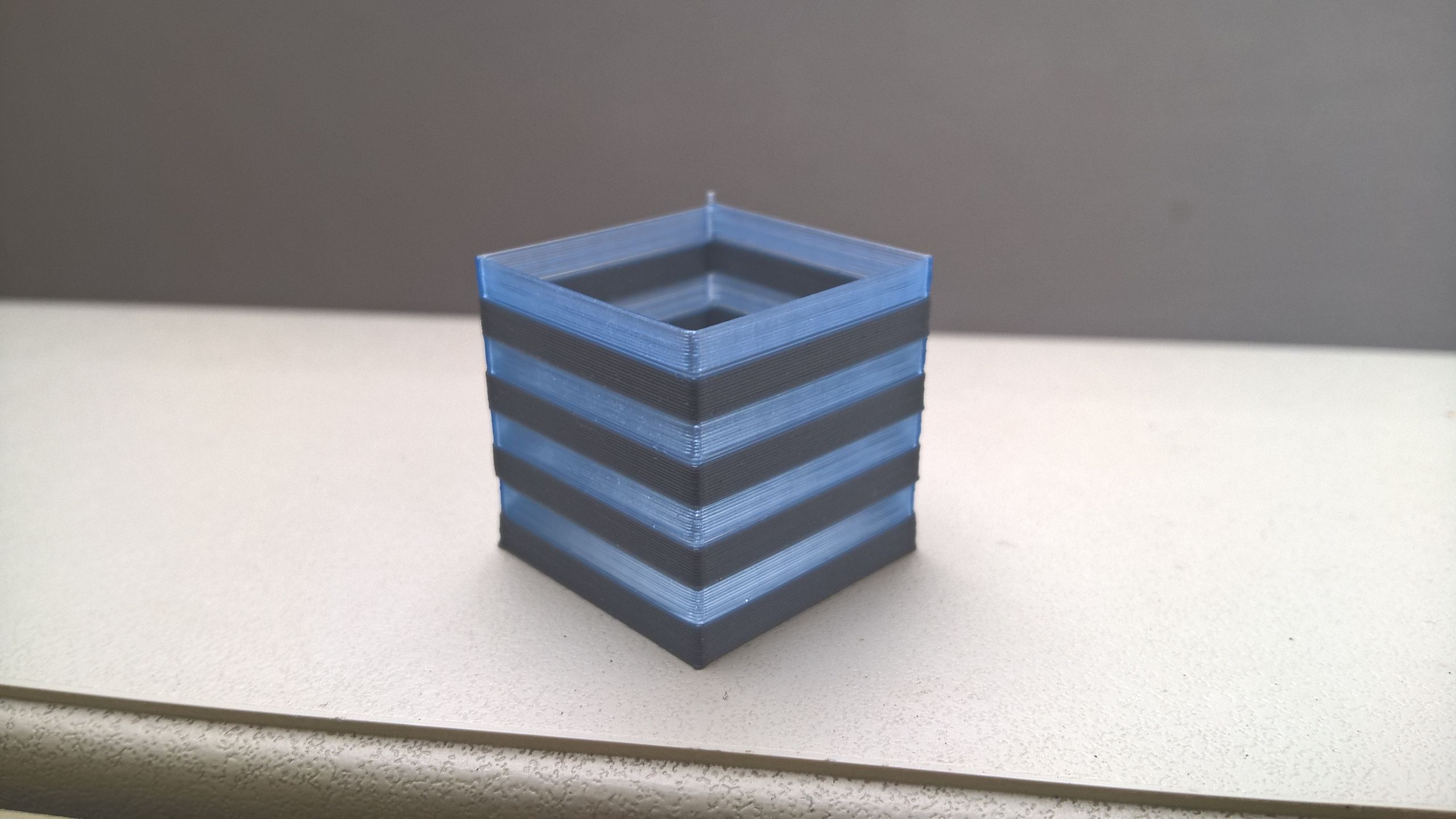 Tak jsem jí vytiskl, ale měl jsem blbě zkalibrovanou tiskárnu, takže výsledek je takoví, že barvy jsou vůči sobě asi o 1mm posunuty. Provedl jsem proto kalibraci na krychličce 25×25×25mm tisknutou jako VASE a po zkalibrování to vypadá takto.
