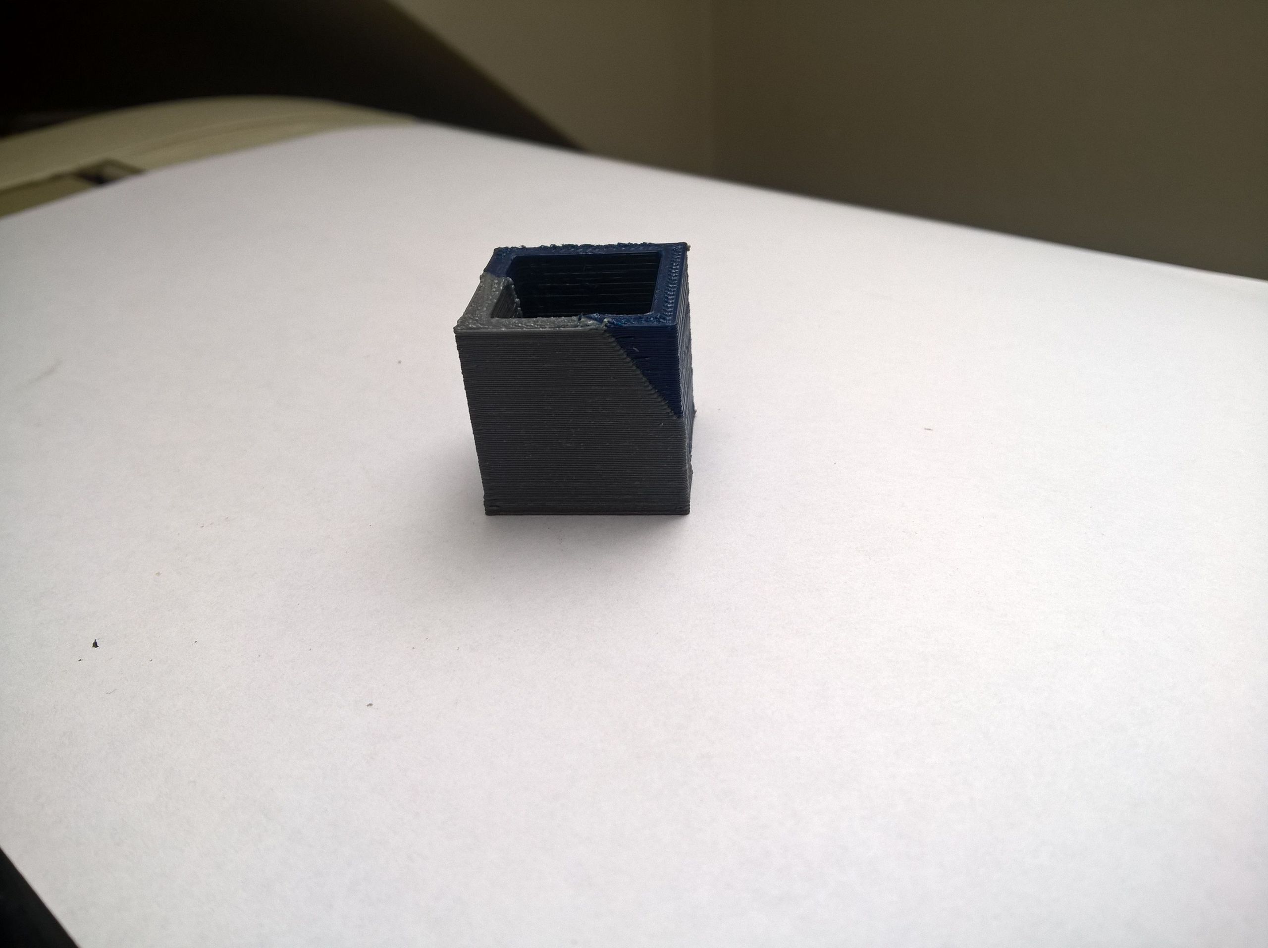 Ty přetoky, co jsou vidět na obr, jsou způsobeny tím, že jsem musel při přepnutí trysky dát aby se filament posunul o 1mm (už jsem to přenastavil na 0,5mm), jelikož když daná tryska netiskne, filament má snahu o kousíček povylézt a proto to vynechávalo viz obr